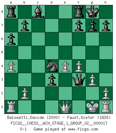 Last move : 0-1 2017 February 15 12:14:54 [Event "FICGS__CHESS__WCH_STAGE_1_GROUP_02__000017"] [Site "FICGS"] [Date "2016.11.02"] [Round "1"] [White "Balosetti,Davide"] [Black "Faust,Dieter"] [Result "0-1"] [WhiteElo "2000"] [BlackElo "1826"] 1.e4 e6 2.c4 c5 3.Nc3 Nc6 4.Nf3 Nge7 5.Be2 Nd4 6.Nxd4 cxd4 7.Nb5 Nc6 8.a4 a6 9.Na3 Bc5 10.d3 O-O 11.f4 d5 12.cxd5 exd5 13.Bf3 dxe4 14.dxe4 d3 15.Nc4 Qd4 16.Ne3 Bb4+ 17.Bd2 Qxe3+ 18.Kf1 Bxd2 19.g3 Be1 20.Qxe1 Qxf3+ 21.Kg1 Nd4 0-1 French defense, Steiner variation Kingside Castling by player Black (move 10) Player Black won this chess game. Follow this game move after move (download)A thorough understanding of the typical mating continuations makes the most complicated sacrificial combinations leading up to them not only not difficult, but almost a matter of course. (Siegbert Tarrasch) Jeder weiß, dass Gasprom Putins persönliches Machtinstrument ist. Die Firma wird vom Kreml aus geleitet und wird schon deshalb nie transparent sein. (Garry Kasparov) Juega la Apertura como un libro, el Juego Medio como un mago y los Finales como una máquina. (Spielmann) Celui qui prend des risques peut perdre, celui qui n'en prend pas perd toujours. (Xavier Tartacover) Unless I accept my faults I will most certainly doubt my virtues. (Hugh Prather)