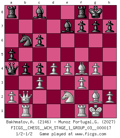 Last move : 1/2-1/2 2016 November 27 6:49:12 [Event "FICGS__CHESS__WCH_STAGE_1_GROUP_03__000017"] [Site "FICGS"] [Date "2016.11.02"] [Round "1"] [White "Bakhmatov,Andrey"] [Black "Munoz Portugal,Guillermo"] [Result "1/2-1/2"] [WhiteElo "2146"] [BlackElo "2027"] 1.d4 Nf6 2.c4 c6 3.Bf4 Qb6 4.Qd2 Ne4 5.Qc2 d5 6.f3 e5 7.Bxe5 Qa5 8.Nc3 Nxc3 9.bxc3 dxc4 10.e4 b5 11.Ne2 Nd7 12.Bf4 Be7 13.g4 O-O 14.Rb1 Nb6 15.Bg2 Qa4 16.Qc1 a5 17.O-O b4 18.Qb2 1/2-1/2 Queen's pawn game Kingside Castling by player Black (move 13) Kingside Castling by player White (move 17) This chess game ended in a draw. Follow this game move after move (download)I'd rather have a Pawn than a finger. (Reuben Fine) Nie in meinem Leben habe ich die französische Verteidigung gespielt, welche die Stumpfsinnigste von allen ist. (Wilhelm Steinitz) No solamente yo pronostico su triunfo sobre Botvinnik, sino que me adelanto y digo que probablemente Fischer es el jugador de Ajedrez mas grande que haya existido. (John Collins) Avec des compensations pour le matériel en plus... (Anonyme) A person who never made a mistake never tried anything new. (Albert Einstein)