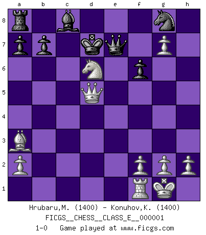 Last move : 1-0 2006 April 24 23:34:20 [Event "FICGS__CHESS__CLASS_E__000001"] [Site "FICGS"] [Date "2006.04.10"] [Round "1"] [White "Hrubaru,Mircea"] [Black "Konuhov,Konstantin"] [Result "1-0"] [WhiteElo "1400"] [BlackElo "1400"] 1.e4 c5 2.Nf3 e6 3.d4 cxd4 4.Nxd4 Nf6 5.Nc3 Bb4 6.e5 Qc7 7.exf6 Bxc3+ 8.bxc3 Qxc3+ 9.Qd2 Qxa1 10.fxg7 Rg8 11.c3 Qb1 12.Bd3 Qb6 13.Qg5 Nc6 14.Bxh7 Ne7 15.Nb5 d6 16.Bxg8 Nxg8 17.Ba3 d5 18.Nd6+ Kd7 19.O-O f6 20.Qh5 Qd8 21.c4 Qe7 22.cxd5 exd5 23.Qxd5 1-0 Sicilian : Pin, Koch variation Kingside Castling by player White (move 19) Player White won this chess game. Follow this game move after move (download)When asked, -How is that you pick better moves than your opponents?, I responded: I'm very glad you asked me that, because, as it happens, there is a very simple answer. I think up my own moves, and I make my opponent think up his. (Alexander Alekhine) Es ist schade, dass viele Schachsportler vergessen, wie wichtig Auftreten und angemessene Kleidung sind. (Alexandra Kosteniuk) Los errores estan ahí, esperando a que se cometan. (Savielly Tartakower) A ce moment-là, je menaçais de comprendre la position ! (Clément L'Heureux) Whoever said the pen is mightier than the sword obviously never encountered automatic weapons. (US General Douglas MacArthur)