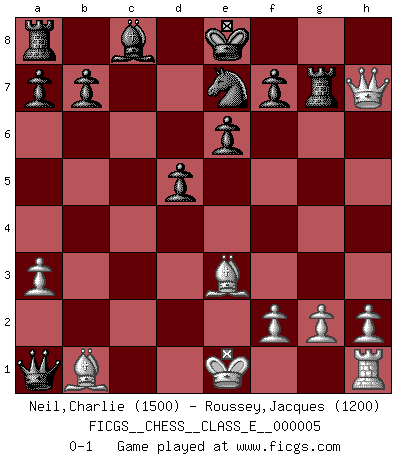 Last move : 0-1 2006 June 22 23:35:35 [Event "FICGS__CHESS__CLASS_E__000005"] [Site "FICGS"] [Date "2006.05.31"] [Round "1"] [White "Neil,Charlie"] [Black "Roussey,Jacques"] [Result "0-1"] [WhiteElo "1500"] [BlackElo "1200"] 1.d4 e6 2.e4 d5 3.Nc3 Bb4 4.e5 c5 5.a3 Bxc3+ 6.bxc3 Qc7 7.Qg4 Ne7 8.Qxg7 Rg8 9.Qxh7 cxd4 10.Nf3 Nbc6 11.cxd4 Nxd4 12.Ng5 Qxe5+ 13.Be3 Rxg5 14.Bd3 Nxc2+ 15.Bxc2 Qxa1+ 16.Bb1 Rg7 0-1 Queen's pawn Player Black won this chess game. Follow this game move after move (download)I'm not a materialistic person, in that, I don't suffer the lack or loss of money. The absence of worldly goods I don't look back on. For Chess is a way I can be as materialistic as I want without having to sell my soul. (Jamie Walter Adams) Wenn ich einen Club besuche, sind die Spieler stumm vor Staunen. (José Raúl Capablanca) Vive, pierde y aprende al observar a tu oponente como ganar. (Amber Steenbock) D'abord les bases : Jouez et étudiez, puis étudiez et jouez, ensuite jouez et étudiez, puis étudiez et jouez. Deuxièmement : Donnez toujours le meilleur de vous-même ! (Ken Smith) Computers are like Old Testament gods; lots of rules and no mercy. (Joseph Campbell)