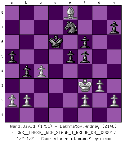 Last move : 1/2-1/2 2016 December 21 3:8:48 [Event "FICGS__CHESS__WCH_STAGE_1_GROUP_03__000017"] [Site "FICGS"] [Date "2016.11.02"] [Round "1"] [White "Ward,David"] [Black "Bakhmatov,Andrey"] [Result "1/2-1/2"] [WhiteElo "1731"] [BlackElo "2146"] 1.e4 c5 2.Nf3 Nc6 3.d4 cxd4 4.Nxd4 Nf6 5.Nc3 e5 6.Ndb5 d6 7.Bg5 a6 8.Na3 b5 9.Nd5 Be7 10.Bxf6 Bxf6 11.c4 b4 12.Nc2 a5 13.g3 O-O 14.Bg2 Bg5 15.O-O Ne7 16.Nce3 Bxe3 17.Nxe3 Be6 18.Qd2 Qb6 19.Rfd1 Rfd8 20.Nf5 Ra7 21.Qg5 Bxf5 22.exf5 d5 23.Bxd5 Rad7 24.f6 Qxf6 25.Qxf6 gxf6 26.Bf3 Kg7 27.Rxd7 Rxd7 28.Rd1 Rxd1+ 29.Bxd1 f5 30.Ba4 Kf6 31.Kg2 Ke6 32.Kf3 Kd6 33.Be8 f6 1/2-1/2 Sicilian : Pelikan (Lasker/Sveshnikov) variation Kingside Castling by player Black (move 13) Kingside Castling by player White (move 15) This chess game ended in a draw. Follow this game move after move (download)When you are lonely, when you feel yourself an alien in the world, play Chess. This will raise your spirits and be your counselor in war. (Aristotle) Wenn sie aufgeben, dann danke ich Ihnen für das Spiel (Eventualzug beim Fernschach). (Anonymous) Bobby solo arroja las piezas y solas caen en las casillas correctas. (Miguel Najdorf ) Les erreurs sont comme les malheurs, elles n'arrivent jamais seules. (Siegbert Tarrasch) Methinks King Thibault should dub Marius Zubac a knight of the square board... I mean table, henceforth addressing him as Sir Marius, and bestow on him a suitable land from the kingdom of FICGS & marry him off to a worthy, fair maiden, lest he slice our heads with his mighty sword in his wrath. (Dinesh De Silva)