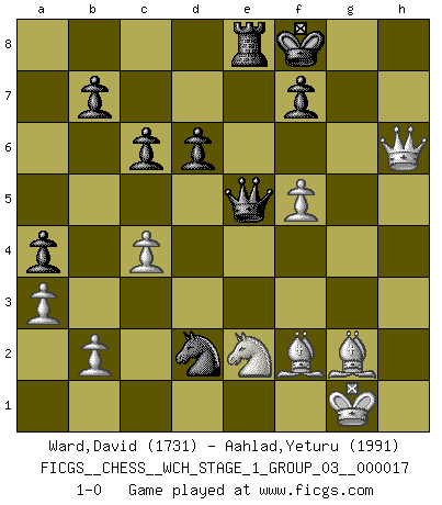 Last move : 1-0 2017 February 6 23:34:46 [Event "FICGS__CHESS__WCH_STAGE_1_GROUP_03__000017"] [Site "FICGS"] [Date "2016.11.02"] [Round "1"] [White "Ward,David"] [Black "Aahlad,Yeturu"] [Result "1-0"] [WhiteElo "1731"] [BlackElo "1991"] 1.d4 Nf6 2.c4 g6 3.g3 c6 4.Bg2 Bg7 5.e4 O-O 6.Ne2 d6 7.Nbc3 e5 8.O-O exd4 9.Nxd4 Nbd7 10.Be3 Re8 11.h3 Nc5 12.Qc2 Qe7 13.Rfe1 a5 14.Rad1 a4 15.f4 Qc7 16.g4 Qa5 17.a3 h5 18.g5 Nfd7 19.Bf2 Qc7 20.Nf5 gxf5 21.exf5 Rxe1+ 22.Rxe1 Qd8 23.Qd1 Nf8 24.f6 Bxf6 25.gxf6 Qxf6 26.Re8 Bg4 27.Rxf8+ Kxf8 28.hxg4 hxg4 29.f5 Qh6 30.Qxg4 Re8 31.Qd4 Nb3 32.Qd1 Qf4 33.Qh5 Nd2 34.Ne2 Qe5 35.Qh6+ 1-0 King's Indian : 3.g3 Kingside Castling by player Black (move 5) Kingside Castling by player White (move 8) Player White won this chess game. Follow this game move after move (download)A sacrifice is best refuted by accepting it. (Wilhelm Steinitz) Modernes Schach sorgt sich zuviel um Dinge wie Bauernstruktur usw. Vergessen Sie das, Schachmatt beendet das Spiel! (Nigel Short) Hay jugadores fuertes y personas amables y yo soy un jugador fuerte. (Bobby Fischer) Le temps de noter son nom sur la feuille de partie, j'étais déjà en zeitnot ! D'un modeste amateur apparié lors de la première ronde d'un open contre le grand-maître Azmaïparashvili. If I had no sense of humor, I would long ago have committed suicide. (Mahatma Gandhi)