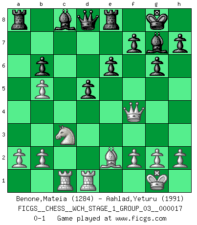 Last move : 0-1 2017 February 18 22:41:19 [Event "FICGS__CHESS__WCH_STAGE_1_GROUP_03__000017"] [Site "FICGS"] [Date "2016.11.02"] [Round "1"] [White "Benone,Mateia"] [Black "Aahlad,Yeturu"] [Result "0-1"] [WhiteElo "1284"] [BlackElo "1991"] 1.Nf3 Nf6 2.c4 g6 3.Nc3 Bg7 4.e4 c5 5.d4 cxd4 6.Nxd4 Nc6 7.Be2 Nxe4 8.Ndb5 a6 9.Nxe4 axb5 10.cxb5 Nd4 11.Bh6 Bxh6 12.Qxd4 O-O 13.Nc3 Bg7 14.Qd5 Re8 15.O-O e6 16.Qd6 Bf8 17.Qf4 d5 18.Rfd1 b6 19.Rac1 Bg7 0-1 Reti Opening Kingside Castling by player Black (move 12) Kingside Castling by player White (move 15) Player Black won this chess game. Follow this game move after move (download)The Chess pieces are the block alphabet which shapes thoughts; and these thoughts, although making a visual design on the chessboard, express their beauty abstractly, like a poem. (Marcel Duchamp) Schach ist ein Teil der Kultur, und wenn es mit der Kultur abwärts geht, geht es auch mit dem Schach abwärts. (Mikhail Moiseyevich Botvinik) El Ajedrez moderno está demasiado preocupado con cosas como la estructura de Peones. Olvidenlo, el Jaque Mate termina la partida. (Nigel Short) On entre au jeu d'Echecs comme on entre en Religion. Pour le joueur d'Echecs, la partie d'Echecs c'est l'office, la messe, le défilé du 1er Mai, le dépôt de gerbe au Monument aux Morts. C'est un drame sacré. (Michel Roos) The existence of forgetting has never been proved: We only know that some things don't come to mind when we want them. (Friedrich Nietzsche)