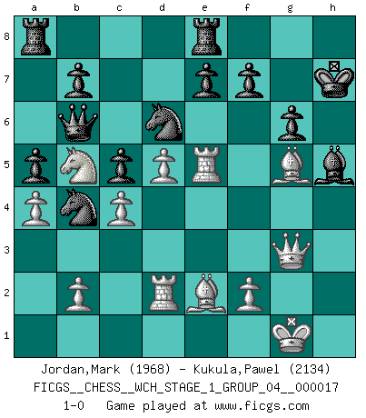 Last move : 1-0 2016 December 25 3:5:45 [Event "FICGS__CHESS__WCH_STAGE_1_GROUP_04__000017"] [Site "FICGS"] [Date "2016.11.02"] [Round "1"] [White "Jordan,Mark"] [Black "Kukula,Pawel"] [Result "1-0"] [WhiteElo "1968"] [BlackElo "2134"] 1.e4 Nf6 2.e5 Nd5 3.c4 Nb6 4.Nf3 d6 5.Nc3 g6 6.d4 dxe5 7.Nxe5 Bg7 8.Be3 Be6 9.Qb3 O-O 10.Rd1 Qc8 11.Nf3 a5 12.a4 Na6 13.Be2 Nb4 14.Rd2 c5 15.d5 Bd7 16.O-O Qc7 17.g3 Nc8 18.Re1 Nd6 19.Bf4 Rfe8 20.Bf1 Bf5 21.Nb5 Qb6 22.h3 h5 23.Ng5 Bf6 24.g4 hxg4 25.hxg4 Bxg4 26.Qg3 Bxg5 27.Bxg5 Bh5 28.Re5 Kh7 29.Be2 1-0 Alekhine's defense Kingside Castling by player Black (move 9) Kingside Castling by player White (move 16) Player White won this chess game. Follow this game move after move (download)Many Chess players were surprised when after the game, Fischer quietly explained: 'I had already analyzed this possibility' in a position which I thought was not possible to foresee from the opening. (Mikhail Tal) Rubinstein ist ein Turmendspiel, welches die Götter vor tausenden von Jahren begannen. (Savielly Grigorievitsch Tartakower) Cuando veas una buena jugada, trata de encontrar otra mejor. (Emanuel Lasker) Vous n'êtes pas toujours obligé de jouer le meilleur coup. Un coup doit être actif, entreprenant, correct et beau ! (David Bronstein) The right perception of any matter and a misunderstanding of the same matter do not wholly exclude each other. (Kafka's the trial)