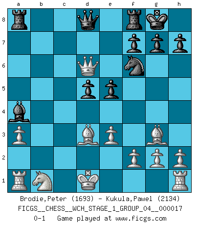 Last move : 0-1 2016 December 1 18:51:34 [Event "FICGS__CHESS__WCH_STAGE_1_GROUP_04__000017"] [Site "FICGS"] [Date "2016.11.02"] [Round "1"] [White "Brodie,Peter"] [Black "Kukula,Pawel"] [Result "0-1"] [WhiteElo "1693"] [BlackElo "2134"] 1.d4 d5 2.Bf4 Nf6 3.Nf3 c5 4.dxc5 e6 5.b4 a5 6.c3 axb4 7.cxb4 Nc6 8.a3 Nxb4 9.Nd4 Nc6 10.Nxc6 bxc6 11.e3 Bxc5 12.Qc2 Bb4+ 13.Kd1 O-O 14.Bd3 Bd6 15.Qxc6 e5 16.Bg3 Bd7 17.Qxd6 Ba4+ 0-1 Queen's pawn, Mason variation Kingside Castling by player Black (move 13) Player Black won this chess game. Follow this game move after move (download)Whoever sees no other aim in the game than that of giving checkmate to one's opponent will never become a good Chess player. (Euwe) Die Leute spielen gegen mich seit 15 Jahren unter Ihren Möglichkeiten. (Robert James Fischer) Si el ingenio solamente fuese necesario para lucirse, las mujeres serían las mejores jugadoras de Ajedrez del mundo. (Albin) Il s'avisa de me proposer d'apprendre les échecs qu'il jouait un peu... me voilà forcené des échecs. J'achète un échiquier, je m'enferme dans ma chambre, j'y passe des jours et des nuits à vouloir apprendre par cur toutes les parties. (Jean-Jacques Rousseau, Confessions) Begin at the beginning and go on till you come to the end; then stop. (Lewis Carrol, Alice in Wonderland)