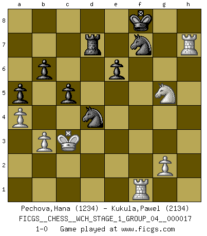 Last move : 1-0 2017 May 5 13:9:33 [Event "FICGS__CHESS__WCH_STAGE_1_GROUP_04__000017"] [Site "FICGS"] [Date "2016.11.02"] [Round "1"] [White "Pechova,Hana"] [Black "Kukula,Pawel"] [Result "1-0"] [WhiteElo "1234"] [BlackElo "2134"] 1.e4 Nf6 2.e5 Nd5 3.d4 d6 4.c4 Nb6 5.f4 dxe5 6.fxe5 c5 7.d5 g6 8.Nc3 Bg7 9.Bf4 O-O 10.Qd2 e6 11.O-O-O f6 12.d6 Nc6 13.Nf3 fxe5 14.Bg5 Qe8 15.h4 Bd7 16.h5 gxh5 17.Bh6 Bxh6 18.Qxh6 Qg6 19.Qxh5 Qxh5 20.Rxh5 Rf5 21.Rh3 Be8 22.Bd3 Bg6 23.Rdh1 Raf8 24.Rg3 Nd4 25.Bxf5 Nxf5 26.Rgh3 Nxc4 27.d7 Rd8 28.b3 Ncd6 29.Nxe5 Nf7 30.Nxg6 hxg6 31.Ne4 b6 32.Rh7 Nd4 33.Nf6+ Kf8 34.Re1 a6 35.Rf1 Nc6 36.Kc2 g5 37.Kc3 a5 38.a4 Nd4 39.Ne4 Rxd7 40.Nxg5 1-0 Alekhine's defense : Four pawns attack Kingside Castling by player Black (move 9) Queenside Castling by player White (move 11) Player White won this chess game. Follow this game move after move (download)Fischer is an American Chess tragedy on par with Morphy and Pillsbury. (Mig Greengard) Fischer machte Schach einfach zu einer aufregenden Sache, wann immer er sich ans Brett setzte. (Raymond Keene) Entre mas años cumplo, mas valoro los Peones. (Keres) Il a essayé de se convaincre qu'il pourrait empêcher toutes les erreurs et ne jamais perdre. L'horreur ! Gary Kasparov au sujet de Robert Fischer. The man who strikes first admits that his ideas have given out. (Chinese proverb)