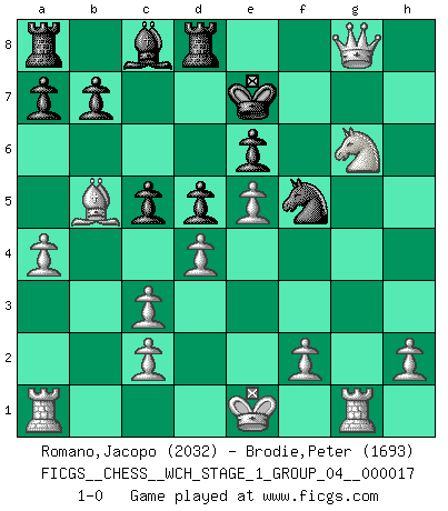 Last move : 1-0 2016 December 5 14:38:14 [Event "FICGS__CHESS__WCH_STAGE_1_GROUP_04__000017"] [Site "FICGS"] [Date "2016.11.02"] [Round "1"] [White "Romano,Jacopo"] [Black "Brodie,Peter"] [Result "1-0"] [WhiteElo "2032"] [BlackElo "1693"] 1.e4 e6 2.d4 d5 3.Nc3 Bb4 4.e5 Bxc3+ 5.bxc3 Nc6 6.Qg4 g6 7.a4 h5 8.Qd1 Nge7 9.Bg5 Qd7 10.Nf3 Nf5 11.Bf6 O-O 12.g4 Nh6 13.gxh5 Ne7 14.Rg1 Nef5 15.Qd2 c5 16.Qg5 Re8 17.hxg6 Kf8 18.Bb5 Qe7 19.Bxe7+ Rxe7 20.gxf7 Rd7 21.Qg8+ Nxg8 22.fxg8Q+ Ke7 23.Nh4 Rd8 24.Ng6+ 1-0 French : Winawer, Advance variation Kingside Castling by player Black (move 11) Promotion Queen by player White (move 22) Player White won this chess game. Follow this game move after move (download)Via the squares on the chessboard, the Indians explain the movement of time and the age, the higher influences which control the world and the ties which link Chess with the human soul. (Al-Masudi) Ein Großmeister muß tausende Partien in seinem Kopf speichern, denn diese sind für Ihn, was die Worte der Muttersprache für gewöhnliche Leute sind, oder Noten für Musiker... (Garry Kasparov) Si el Ajedrez es una ciencia, es la mas inexacta. Si el Ajedrez es un arte, es demasiado inexacto para ser visto como tal. Si el Ajedrez es un deporte, es demasiado esotérico. Si el Ajedrez es un juego, es demasiado exigente para ser solo un juego. Si el Ajedrez es una aventura, es una muy demandante. Si el Ajedrez es una pasión, es una muy gratificante. Si el Ajedrez es la vida, es una muy triste. (Anónimo) Donnez-moi un Cavalier en 6e et je gagnerais toutes mes parties. (Steinitz) There are more things in heaven and earth than practically anywhere else. (Unknown)