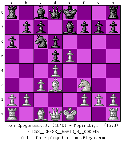 Last move : 0-1 2007 April 9 22:52:46 [Event "FICGS__CHESS__RAPID_B__000045"] [Site "FICGS"] [Date "2007.03.29"] [Round "1"] [White "van Speybroeck,Dirk-Jan"] [Black "Kepinski,Janusz"] [Result "0-1"] [WhiteElo "1640"] [BlackElo "1673"] 1.e4 e6 2.Nc3 Nf6 3.e5 Nd5 4.Nxd5 exd5 5.d4 d6 6.Nf3 Be7 7.Bd3 Nc6 8.c3 a6 0-1 French defense Player Black won this chess game. Follow this game move after move (download)Pawns are born free, yet they are everywhere in chains. (Rick Kennedy) Vom Schach wurde gesagt das Leben sei dafür nicht lange genug. Aber das ist der Fehler des Lebens, nicht des Schach'. (Irving Chernev) El Ajedrez era la lengua materna de Capablanca. (Reti) Nous sommes les pions de la mystérieuse partie d'Echecs jouée par Dieu. Il nous déplace, nous arrête, nous pousse encore, puis nous lance un à un dans la boîte du Néant. Epitaphe sur la tombe de David Janowsky (1868-1927). The problem with troubleshooting is that trouble shoots back. (Anonymous)