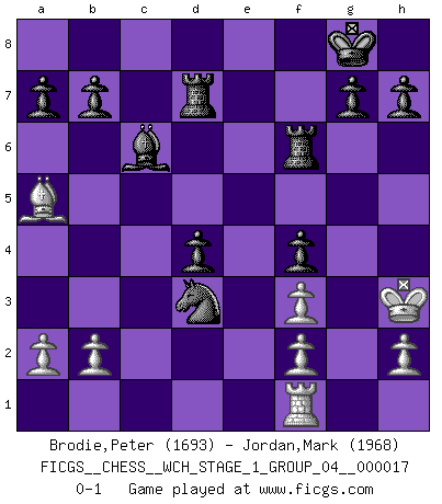 Last move : 0-1 2016 November 24 18:47:6 [Event "FICGS__CHESS__WCH_STAGE_1_GROUP_04__000017"] [Site "FICGS"] [Date "2016.11.02"] [Round "1"] [White "Brodie,Peter"] [Black "Jordan,Mark"] [Result "0-1"] [WhiteElo "1693"] [BlackElo "1968"] 1.e4 e6 2.Nf3 d5 3.e5 c5 4.Nc3 Nc6 5.Bb5 Nge7 6.O-O Bd7 7.Bxc6 Nxc6 8.d4 cxd4 9.Nxd4 Nxe5 10.Bf4 Ng6 11.Bg3 Bc5 12.Nb3 Bb6 13.Nd4 O-O 14.Qd3 e5 15.Nxd5 Bxd4 16.c3 Bc6 17.cxd4 Qxd5 18.Qf3 Qxf3 19.gxf3 exd4 20.Rad1 Rad8 21.Kg2 f5 22.Bc7 Rd7 23.Ba5 Rf6 24.Kg3 f4+ 25.Kh3 Ne5 26.Rd3 Nxd3 0-1 French defense Kingside Castling by player White (move 6) Kingside Castling by player Black (move 13) Player Black won this chess game. Follow this game move after move (download)Chess books should be used as we use glasses: to assist the sight, although some players make use of them as if they thought they conferred sight. (Jose Raul Capablanca) Wenn Du einsam bist, wenn Du Dich in der Welt wie ein Fremder fühlst, spiele Schach. Das wird Deinen Geist erheben und Dein Ratgeber im Kampf sein. (Aristoteles) La pasion por jugar al Ajedrez es una de las mas inexplicables en el mundo. (H.G. Wells) Je fais ceci parce que dans cinquante coups j'obtiendrai cela; je m'appelle Mikhail Moisevitch Botvinnik. (Botvinnik) The meaning of life is that it is to be lived, and it is not to be traded and conceptualized and squeezed into a pattern of systems. (Bruce Lee)