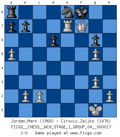 Last move : 1-0 2017 January 19 15:34:31 [Event "FICGS__CHESS__WCH_STAGE_1_GROUP_04__000017"] [Site "FICGS"] [Date "2016.11.02"] [Round "1"] [White "Jordan,Mark"] [Black "Cirovic,Zeljko"] [Result "1-0"] [WhiteElo "1968"] [BlackElo "1476"] 1.e4 d6 2.d4 g6 3.Nf3 Bg7 4.Nc3 Nf6 5.Be2 O-O 6.O-O Bg4 7.Be3 Bxf3 8.Bxf3 c6 9.Qd2 Ne8 10.g3 e5 11.dxe5 Bxe5 12.Bg2 Nd7 13.f4 Bg7 14.a4 f5 15.a5 fxe4 16.Nxe4 Ndf6 17.Ng5 Qe7 18.Rae1 h6 19.Bd4 Qxe1 20.Rxe1 hxg5 21.fxg5 Nd5 22.Bxd5+ cxd5 23.Bxg7 Kxg7 24.Re7+ Rf7 25.Qd4+ Kg8 26.Qxd5 Kf8 27.Qxf7+ 1-0 King's pawn Opening Kingside Castling by player Black (move 5) Kingside Castling by player White (move 6) Player White won this chess game. Follow this game move after move (download)The mistakes are there, waiting to be made. (Savielly Tartakower) Der beste Spieler in einem Turnier gewinnt es nie. Er landet auf Platz zwei oder drei. (Siegbert Tarrasch) Una mala movida nulifica cuarenta buenas. (Horowitz) On entre au jeu d'Echecs comme on entre en Religion. Pour le joueur d'Echecs, la partie d'Echecs c'est l'office, la messe, le défilé du 1er Mai, le dépôt de gerbe au Monument aux Morts. C'est un drame sacré. (Michel Roos) To err is human, to shift the blame on someone else is tactical. (Mladen Jankovic)