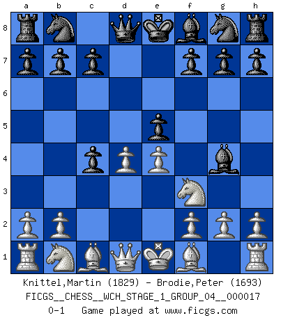 Last move : 0-1 2016 December 7 7:55:51 [Event "FICGS__CHESS__WCH_STAGE_1_GROUP_04__000017"] [Site "FICGS"] [Date "2016.11.02"] [Round "1"] [White "Knittel,Martin"] [Black "Brodie,Peter"] [Result "0-1"] [WhiteElo "1829"] [BlackElo "1693"] 1.d4 d5 2.c4 dxc4 3.e4 e5 4.Nf3 Bg4 0-1 This chess game has been lost on time (started : 2016.11.02 2:19:27) QGA : 3.e4 Player Black won this chess game. Follow this game move after move (download)The laws of Chess do not permit a free choice: you have to move whether you like it or not. (Emanuel Lasker) Taktik ist was man tun muß, wenn etwas zu tun ist. Strategie ist was man tun muß, wenn nichts zu tun ist. (Savielly Grigorievitsch Tartakower) Del Ajedrez se ha dicho que la vida no es lo suficientemente larga para él, pero eso es culpa de la vida, no del Ajedrez. (William Ewart Napier) Soyez une menace à chaque fois que vous vous asseyez pour jouer. (Ken Smith) Horse racing is animated roulette. (Roger Kahn)