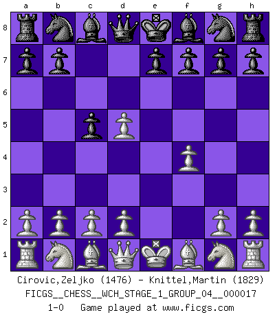 Last move : 1-0 2016 December 6 7:43:43 [Event "FICGS__CHESS__WCH_STAGE_1_GROUP_04__000017"] [Site "FICGS"] [Date "2016.11.02"] [Round "1"] [White "Cirovic,Zeljko"] [Black "Knittel,Martin"] [Result "1-0"] [WhiteElo "1476"] [BlackElo "1829"] 1.e4 c5 2.f4 d5 3.exd5 1-0 This chess game has been lost on time (started : 2016.11.02 2:19:27) Sicilian : Grand Prix attack Player White won this chess game. Follow this game move after move (download)A Chess game is a dialogue, a conversation between a player and his opponent. Each move by the opponent may contain threats or be a blunder, but a player cannot defend against threats or take advantage of blunders if he does not first ask himself: What is my opponent planning after each move ? (Bruce A. Moon) Mein Gehirn das ist mein zweitwichtigstes Organ [Aus dem Film: Der Schläfer]. (Woody Allen) Una clavada es mas poderosa que una espada. (Fred Reinfeld) Comme les marins qui ont mille raisons différentes d'aller en mer, les joueurs d'échecs en ont tout autant avant de s'installer devant une table et jouer... (Vincent Bertignac, philosophe) The difference between perseverance and obstinacy is that one comes from a strong will, and the other from a strong won't. (Henry Ward Beecher)