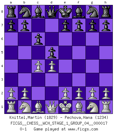 Last move : 0-1 2016 December 6 19:51:12 [Event "FICGS__CHESS__WCH_STAGE_1_GROUP_04__000017"] [Site "FICGS"] [Date "2016.11.02"] [Round "1"] [White "Knittel,Martin"] [Black "Pechova,Hana"] [Result "0-1"] [WhiteElo "1829"] [BlackElo "1234"] 1.d4 d5 2.c4 c6 0-1 This chess game has been lost on time (started : 2016.11.02 2:19:27) QGD Slav defense Player Black won this chess game. Follow this game move after move (download)The Pawns are the soul of the game. (Francois Andre Danican Philidor) Zeige mir drei Eröffnungsvarianten und ich beweise dir, dass zwei davon inkorrekt sind. (Emanuel Lasker) Debió haber existido una vez en que los hombres eran semidióses, de otra manera no hubiesen podido inventar el Ajedrez. (Gustav Schenk) Horreur, mais aussi harmonie suprême : qu'y avait-il en effet au monde en dehors des échecs ? Le brouillard, l'inconnu, le non-être... (Vladimir Nabokov) Employ the attack like tactic of defense. (Chinese proverb)