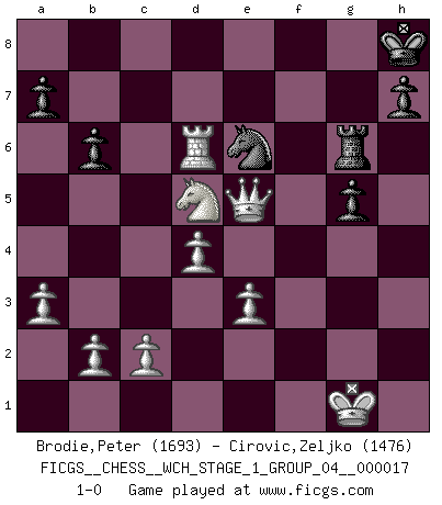 Last move : 1-0 2017 February 1 1:25:18 [Event "FICGS__CHESS__WCH_STAGE_1_GROUP_04__000017"] [Site "FICGS"] [Date "2016.11.02"] [Round "1"] [White "Brodie,Peter"] [Black "Cirovic,Zeljko"] [Result "1-0"] [WhiteElo "1693"] [BlackElo "1476"] 1.d4 e6 2.Bf4 Bd6 3.Bxd6 cxd6 4.Nc3 Ne7 5.Nf3 O-O 6.e3 b6 7.Bd3 Bb7 8.O-O Ng6 9.Qe2 Nc6 10.a3 f5 11.g3 e5 12.Bc4+ Kh8 13.h4 Na5 14.Bd5 e4 15.Bxb7 Nxb7 16.Nd2 Nxh4 17.gxh4 Qxh4 18.f3 Rf6 19.Rf2 Raf8 20.Rh2 Rg6+ 21.Kh1 exf3 22.Nxf3 Qf6 23.Rg1 Rxg1+ 24.Kxg1 f4 25.Nd5 Qf5 26.Nh4 Qxd5 27.Ng6+ Kg8 28.Ne7+ Kh8 29.Nxd5 f3 30.Qf2 g5 31.Qg3 f2+ 32.Rxf2 Rg8 33.Rf7 Nd8 34.Rxd7 Ne6 35.Rxd6 Rg6 36.Qe5+ 1-0 This chess game has been lost on time (started : 2016.11.02 2:19:27) Queen's pawn Kingside Castling by player Black (move 5) Kingside Castling by player White (move 8) Player White won this chess game. Follow this game move after move (download)When you don't know what to do, wait for your opponent to get an idea - it's sure to be wrong. (Tarrasch) Smyslow ist ein Beweis dafür, dass ich noch zehn Jahre spielen kann! [der 75 jährige über den 85 jährigen] (Viktor Kortschnoi) Fischer sacrificó virtualmente todo lo que la mayoría de nosotros los 'debiles' (término que él usa) valoramos, respetamos y apreciamos por el amor de un astuto, a menudo hermoso tablero de juego, por el privilegio ambivalente de ser su mas grande maestro. (Paul Kollar) Shah mat. Le roi est mort. Cri de fierté d'un joueur venant de terrasser son adversaire, courtoisement, sans effusion de sang. Real knowledge is to know the extent of one's ignorance. (Confucius)