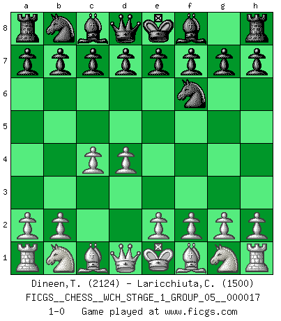 Last move : 1-0 2016 December 6 19:51:12 [Event "FICGS__CHESS__WCH_STAGE_1_GROUP_05__000017"] [Site "FICGS"] [Date "2016.11.02"] [Round "1"] [White "Dineen,Thomas"] [Black "Laricchiuta,Claudio"] [Result "1-0"] [WhiteElo "2124"] [BlackElo "1500"] 1.d4 Nf6 2.c4 1-0 This chess game has been lost on time (started : 2016.11.02 2:19:29) Queen's pawn game Player White won this chess game. Follow this game move after move (download)First-class players lose to second class players because second-class players sometimes play a first-class game. (Tarrasch) Es ist nicht das erste mal, dass sich die FIDE dem Arabischen Geld gebeugt hat (über die FIDE WM 2004 in Lybien). (Larry Evans) Las ideas audaces son como las piezas del Ajedrez que avanzan hacia adelante. Ellas pueden ser vencidas, pero también pueden iniciar una partida victoriosa. (Goethe) RxDa4 pat (...) If we don't succeed, we run the risk of failure. (George W. Bush)