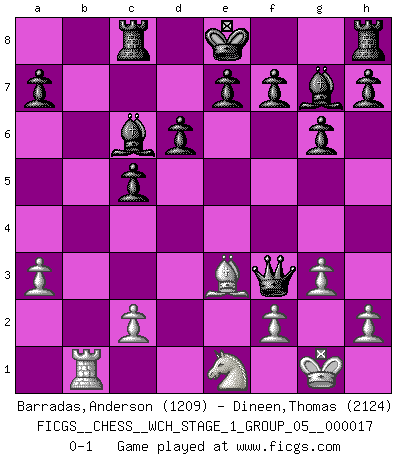 Last move : 0-1 2016 November 12 21:1:56 [Event "FICGS__CHESS__WCH_STAGE_1_GROUP_05__000017"] [Site "FICGS"] [Date "2016.11.02"] [Round "1"] [White "Barradas,Anderson"] [Black "Dineen,Thomas"] [Result "0-1"] [WhiteElo "1209"] [BlackElo "2124"] 1.e4 c5 2.Nf3 d6 3.d4 cxd4 4.Nxd4 Nf6 5.Nc3 g6 6.g3 Nc6 7.Bb5 Bd7 8.Bxc6 bxc6 9.Qe2 Bg7 10.O-O Qb6 11.Qd3 Nxe4 12.Be3 Nc5 13.Qd2 Qxb2 14.Rfb1 Qa3 15.Nb3 Qb4 16.Nxc5 Qxc3 17.Na6 Rc8 18.Qd1 Qc4 19.Nb4 Bxa1 20.a3 Bg7 21.Nd3 c5 22.Nb2 Qe6 23.Nd3 Qe4 24.Ne1 Bc6 25.Qf3 Qxf3 0-1 Sicilian : Dragon variation Kingside Castling by player White (move 10) Player Black won this chess game. Follow this game move after move (download)Fischer wanted to give the Russians a taste of their own medicine. (Larry Evans) Ich kenne Menschen, die allen Willen der Welt besitzen und doch nicht Schach spielen können. (Robert James Fischer) ¿Esta Bobby Fischer algo cuerdo?. (Salo Flohr) Toutes les manuvres exécutées sur une colonne ouverte ont pour but ultime l'intrusion définitive sur la septième ou la huitième rangée, en plein cur de la position ennemie. (Aaron Nimzovitch) The real voyage of discovery consists not in seeking new lands but in seeing with new eyes. (Marcel Proust)