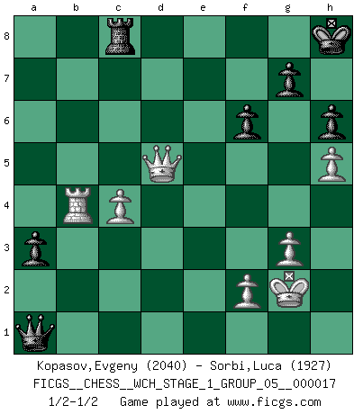 Last move : 1/2-1/2 2017 February 5 4:51:4 [Event "FICGS__CHESS__WCH_STAGE_1_GROUP_05__000017"] [Site "FICGS"] [Date "2016.11.02"] [Round "1"] [White "Kopasov,Evgeny"] [Black "Sorbi,Luca"] [Result "1/2-1/2"] [WhiteElo "2040"] [BlackElo "1927"] 1.d4 Nf6 2.c4 e6 3.Nc3 Bb4 4.Qc2 O-O 5.Nf3 c5 6.dxc5 Na6 7.g3 Nxc5 8.Bg2 Nce4 9.O-O Nxc3 10.bxc3 Be7 11.e4 d6 12.e5 dxe5 13.Nxe5 Qc7 14.Qe2 Bd6 15.Re1 Nd7 16.Bf4 Nxe5 17.Bxe5 Bxe5 18.Qxe5 Qxc4 19.a3 a5 20.Red1 h6 21.Rab1 Qa2 22.Qc5 Ra6 23.Be4 e5 24.Ra1 Qb3 25.Rab1 Qa2 26.Bxb7 Bxb7 27.Rxb7 R6a8 28.Re1 Rfe8 29.Rxe5 Rxe5 30.Qxe5 Qxa3 31.Qd5 Rf8 32.c4 Qa2 33.Kg2 a4 34.h4 a3 35.Qd3 Rc8 36.Rb3 Ra8 37.Rb4 Kh8 38.h5 f6 39.Rb1 Rc8 40.Rb3 Ra8 41.Rb4 Qa1 42.Qd5 Rc8 1/2-1/2 Nimzo-Indian : Classical variation Kingside Castling by player Black (move 4) Kingside Castling by player White (move 9) This chess game ended in a draw. Follow this game move after move (download)Good offense and good defense both begin with good development. (Bruce A. Moon) Du weisst es gibt ein Problem mit Computern und Fernschach, wenn jeder eine Rating von 2450 hat. (John Christen Knudsen) La pasion por jugar al Ajedrez es una de las mas inexplicables en el mundo. (H.G. Wells) Le pion, dans sa simplicité, marche droit devant lui, mais lorsqu'il prend, il le fait obliquement? Ainsi l'homme, tant qu'il reste pauvre, marche dans la droiture et vit honnêtement, mais lorsqu'il recherche les honneurs, il flatte, se parjure et, par les voies obliques, cherche une position supérieure sur l'échiquier du monde. (Jean de Galles) When I took office, only high energy physicists had ever heard of what is called the World Wide Web... Now even my cat has its own page. (Bill Clinton, 1996)