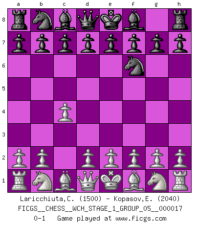 Last move : 0-1 2016 December 3 7:27:2 [Event "FICGS__CHESS__WCH_STAGE_1_GROUP_05__000017"] [Site "FICGS"] [Date "2016.11.02"] [Round "1"] [White "Laricchiuta,Claudio"] [Black "Kopasov,Evgeny"] [Result "0-1"] [WhiteElo "1500"] [BlackElo "2040"] 1.c4 Nf6 0-1 This chess game has been lost on time (started : 2016.11.02 2:19:29) English, 1...Nf6 (Anglo-Indian defense) Player Black won this chess game. Follow this game move after move (download)Different people feel differently about resigning. (Bobby Fischer) Capablanka war das größte Genie der Schachgeschichte! Aber denken sie nicht er habe nichts vom Schach verstanden. Er wusste nur soviel wie er wissen musste um seine Ziele zu erreichen. (Mikhail Moiseyevich Botvinik) Yo he agregado estos principios a la ley: pongan los Caballos en acción antes de que los dos Alfiles sean desarrollados. (Emanuel Lasker) Je ne crois pas en la psychologie, je crois aux bons coups. (Robert Fischer) Do you know these so called Volunteers don't even get paid! (Simpsons)