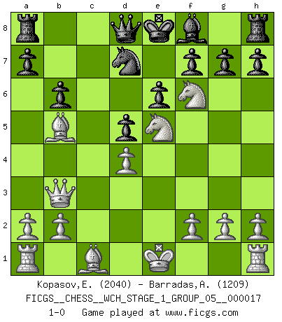 Last move : 1-0 2016 November 3 11:34:14 [Event "FICGS__CHESS__WCH_STAGE_1_GROUP_05__000017"] [Site "FICGS"] [Date "2016.11.02"] [Round "1"] [White "Kopasov,Evgeny"] [Black "Barradas,Anderson"] [Result "1-0"] [WhiteElo "2040"] [BlackElo "1209"] 1.d4 d5 2.c4 c6 3.Nf3 Nf6 4.Nc3 Bg4 5.Ne5 Bf5 6.cxd5 cxd5 7.e4 Bxe4 8.Qb3 b6 9.Bb5+ Nbd7 10.Nxe4 e6 11.Nxf6+ 1-0 QGD Slav : 4.Nc3 Player White won this chess game. Follow this game move after move (download)You have to have the fighting spirit. You have to force moves and take chances. (Bobby Fischer) Die größte Kunst beim Schach besteht darin dem Gegner nicht zu zeigen was er tun kann. (Garry Kasparov) Preferería tener un Peón que un dedo. (Reuben Fine) Même si l'adversaire joue le coup analysé précédemment, recommencez l'analyse en voyant la nouvelle position. Première règle de Blumenfeld When it is a question of money, everybody is of the same religion. (Voltaire)
