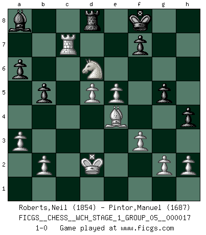 Last move : 1-0 2016 November 24 20:10:32 [Event "FICGS__CHESS__WCH_STAGE_1_GROUP_05__000017"] [Site "FICGS"] [Date "2016.11.02"] [Round "1"] [White "Roberts,Neil"] [Black "Pintor,Manuel"] [Result "1-0"] [WhiteElo "1854"] [BlackElo "1687"] 1.d4 d5 2.Bf4 Bf5 3.e3 a6 4.c4 c6 5.Qb3 Qa5+ 6.Nd2 b5 7.cxd5 e6 8.dxe6 Bxe6 9.Qc2 Nd7 10.Qxc6 Rd8 11.Bc7 Ne7 12.Qxd7+ Rxd7 13.Bxa5 Nc6 14.Bb6 Bb4 15.Rc1 Ne7 16.a3 Bxd2+ 17.Kxd2 O-O 18.Bd3 Rc8 19.Rxc8+ Nxc8 20.Bc5 Nd6 21.Bxd6 Rxd6 22.Ne2 g5 23.Rc1 Kg7 24.Rc5 h6 25.e4 Bg4 26.e5 Rd8 27.d5 h5 28.f3 Bc8 29.Nd4 Bb7 30.Nf5+ Kf8 31.Be4 h4 32.Nd6 Ba8 33.Rc7 1-0 Queen's pawn, Mason variation Kingside Castling by player Black (move 17) Player White won this chess game. Follow this game move after move (download)Fischer was a master of clarity and a king of artful positioning. His opponents would see where he was going but were powerless to stop him. (Bruce Pandolfini) Sitze auf Deine Hände. (Siegbert Tarrasch) Cuando tengo las piezas blancas, yo gano porque soy blanco; Cuando tengo las piezas negras, yo gano porque soy Bogolyubov. (Bogolyubov) Le succès, c'est être capable d'aller d'échec en échec sans perdre son enthousiasme. (Winston Churchill) The only thing that matters is the evidence. (Horatio Caine, C.S.I. Miami)