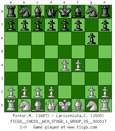 Last move : 1-0 2016 December 3 19:29:57 [Event "FICGS__CHESS__WCH_STAGE_1_GROUP_05__000017"] [Site "FICGS"] [Date "2016.11.02"] [Round "1"] [White "Pintor,Manuel"] [Black "Laricchiuta,Claudio"] [Result "1-0"] [WhiteElo "1687"] [BlackElo "1500"] 1.e4 g6 2.f4 1-0 This chess game has been lost on time (started : 2016.11.02 2:19:29) Robatsch (Modern) defense Player White won this chess game. Follow this game move after move (download)Chess is a matter of delicate judgment, knowing when to punch and how to duck. (Bobby Fischer) Obwohl ich alt bin, darf mir niemand den Finger in den Mund stecken, sonst beisse ich. (Wilhelm Steinitz) El Ajedrez hace al hombre ser mas sabio y ver mas claro. (Vladimir Putin) Avec des compensations pour le matériel en plus... (Anonyme) I just play for fun. (Anna Kournikova)