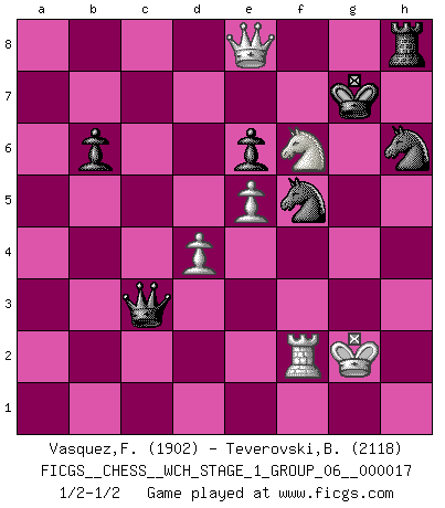 Last move : 1/2-1/2 2017 April 11 9:48:59 [Event "FICGS__CHESS__WCH_STAGE_1_GROUP_06__000017"] [Site "FICGS"] [Date "2016.11.02"] [Round "1"] [White "Vasquez,Fernando"] [Black "Teverovski,Bogoljub"] [Result "1/2-1/2"] [WhiteElo "1902"] [BlackElo "2118"] 1.e4 e6 2.d4 d5 3.e5 c5 4.c3 Qb6 5.Nf3 Nc6 6.a3 Nh6 7.b4 cxb4 8.axb4 Nf5 9.g4 Nh6 10.h3 Bd7 11.Bd3 Ng8 12.Nbd2 Nce7 13.O-O h5 14.Nb3 hxg4 15.hxg4 Bb5 16.Ng5 Bxd3 17.Qxd3 Qc7 18.Nc5 b6 19.Na6 Qd7 20.f4 g6 21.b5 Nh6 22.Qh3 Rc8 23.Rb1 Rc4 24.Ba3 Neg8 25.Bb4 Bxb4 26.Nxb4 Ne7 27.Ra1 Kf8 28.Ra3 Rc8 29.Rf2 Qxb5 30.Rxa7 Qc4 31.f5 gxf5 32.gxf5 Nexf5 33.Qh5 Rc7 34.Rxc7 Qxc7 35.Nxd5 Qa7 36.Nf6 Qa1+ 37.Kg2 Qxc3 38.Nxe6+ fxe6 39.Qe8+ Kg7 40.Nh5+ Kh7 41.Nf6+ Kg7 42.Nh5+ Kh7 43.Nf6+ Kg7 1/2-1/2 French : Advance variation Kingside Castling by player White (move 13) This chess game ended in a draw. Follow this game move after move (download)I like to say that Bobby Fischer was the greatest player ever. But what made Fischer a genius was his ability to blend an American freshness and pragmatism with Russian ideas about strategy. (Bruce Pandolfini) Kann Schach nicht schließlich das Nationalspiel der Deutschen werden? Und welche weiteren Ausblicke bieten sich dann dar! Welche Hebung des allgemeinen Kultur-Niveaus, ja der Moral, wenn das Schachbrett den Kartentisch verdrängen würde! Wahrlich, ein Ziel, des Schweißes der Edlen wert! (Siegbert Tarrasch) Yo nunca en mi vida he jugado la Defensa Francesa, que viene siendo la más aburrida de todas las Aperturas. (Wilhelm Steinitz) Le moment que je préfère le plus dans une rencontre, c'est celui où je sens que la personnalité de l'adversaire se brise. (Robert Fischer) Just because you do not take an interest in politics doesn't mean politics won't take an interest in you. (Pericles 430 B.C.)