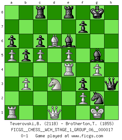 Last move : 0-1 2017 May 3 14:27:8 [Event "FICGS__CHESS__WCH_STAGE_1_GROUP_06__000017"] [Site "FICGS"] [Date "2016.11.02"] [Round "1"] [White "Teverovski,Bogoljub"] [Black "Brotherton,Trevor"] [Result "0-1"] [WhiteElo "2118"] [BlackElo "1855"] 1.d4 d6 2.Nf3 g6 3.e4 Bg7 4.Nc3 Nf6 5.Be2 O-O 6.O-O c6 7.a4 Nbd7 8.h3 e5 9.dxe5 dxe5 10.Bc4 Qa5 11.Bd2 Qc5 12.b3 Nb6 13.Bd3 Re8 14.a5 Nbd7 15.Bc4 Nf8 16.Qe1 Qe7 17.Qe3 Nh5 18.Bc1 Nf4 19.Ba3 Qf6 20.Ne2 Be6 21.Bd3 Nd7 22.Rfd1 b5 23.Rab1 a6 24.c4 Rad8 25.Bd6 g5 26.c5 h5 27.Ne1 Bh6 28.Nxf4 exf4 29.Qe2 g4 30.e5 Qg7 31.hxg4 hxg4 32.Be4 f3 33.Qb2 Rc8 34.Qc3 Bf4 35.Nd3 Bg5 36.Re1 Nf8 37.Ra1 Ng6 38.Qc2 Nh4 39.g3 Ng2 40.Qd1 Qh6 41.Bxf3 gxf3 42.Re4 Qh5 43.g4 Qh3 0-1 Queen's Pawn Kingside Castling by player Black (move 5) Kingside Castling by player White (move 6) Player Black won this chess game. Follow this game move after move (download)In a gambit you give up a Pawn for the sake of getting a lost game. (Samuel Standige Boden) Fischer ist das größte Genie, das je vom Schachhimmel heruntergestiegen ist. (Mikhail Nekhemyevich Tal) El pensamiento metódico es mas útil en el Ajedrez que la inspiración. (C. J. S. Purdy) D'abord les bases : Jouez et étudiez, puis étudiez et jouez, ensuite jouez et étudiez, puis étudiez et jouez. Deuxièmement : Donnez toujours le meilleur de vous-même ! (Ken Smith) Memory is a complicated thing, a relative to truth, but not its twin. (Barbara Kingsolver, Animal Dreams)