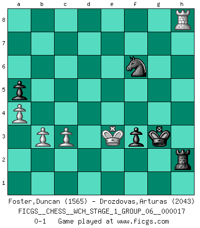 Last move : 0-1 2017 March 5 14:27:29 [Event "FICGS__CHESS__WCH_STAGE_1_GROUP_06__000017"] [Site "FICGS"] [Date "2016.11.02"] [Round "1"] [White "Foster,Duncan"] [Black "Drozdovas,Arturas"] [Result "0-1"] [WhiteElo "1565"] [BlackElo "2043"] 1.e4 e5 2.Nf3 Nc6 3.Bc4 Nf6 4.Ng5 d5 5.exd5 Na5 6.Bb5+ c6 7.dxc6 bxc6 8.Be2 h6 9.Nh3 Bd6 10.Nc3 O-O 11.d3 Re8 12.O-O Nb7 13.Be3 Nc5 14.Bf3 Qc7 15.Ne4 Ncxe4 16.dxe4 g5 17.Nxg5 hxg5 18.Bxg5 Be7 19.Qd3 Nh7 20.Bxe7 Qxe7 21.b3 Rd8 22.Qe2 Ng5 23.Rad1 Be6 24.Bg4 Qf6 25.h4 Qf4 26.Bxe6 Nxe6 27.g3 Qh6 28.c3 Qg6 29.Kh2 a5 30.f3 Qh6 31.Qf2 Kh7 32.Rg1 Qf8 33.Kh3 Qe7 34.Qe2 Qc5 35.Rxd8 Rxd8 36.Rc1 Ng7 37.Rc2 Nh5 38.Qf2 Qd6 39.Qe3 Qd1 40.Rc1 Qd7+ 41.Kh2 Qd2+ 42.Qxd2 Rxd2+ 43.Kh3 Kg6 44.a4 Rf2 45.f4 exf4 46.gxf4 Rf3+ 47.Kg2 Rxf4 48.Rd1 Rxh4 49.Rd6+ Kg5 50.Rxc6 Rxe4 51.Kf3 f5 52.Rc5 Rh4 53.Ke3 Kg4 54.Kd2 Rh2+ 55.Kd3 f4 56.Rc8 f3 57.Rg8+ Kh3 58.Ke3 Nf6 59.Rh8+ Kg3 0-1 Two knights defense Kingside Castling by player Black (move 10) Kingside Castling by player White (move 12) 10 pieces endgame at move 50 : White KRPPP , Black KRNPP WHITE : King + 1 Rook 3 Pawns BLACK : King + 1 Rook 1 Knight 2 Pawns Player Black won this chess game. Follow this game move after move (download)Tactics flow from a superior position. (Bobby Fischer) Irgendwie scheint mir sonntags früh um 9 Uhr der Killerinstinkt verloren gegangen zu sein. (Alexej Shirov) Cuando tengo las piezas blancas, yo gano porque soy blanco; Cuando tengo las piezas negras, yo gano porque soy Bogolyubov. (Bogolyubov) Botvinnik disait en comparant les échecs à la musique: Il existe une science dont le but est l'étude de l'acoustique et des sons. Mais il y a aussi un art qui se sert de l'océan des sons : c'est la musique. De toute évidence, il en est de même pour la pensée. La logique est l'étude des lois de la réflexion et les échecs reflètent, en tant qu'art, le côté logique de la réflexion, sous la forme d'images artistiques... Extrait de Fischer - Spassky, Reykjavik 1972 par Alexander & F. Wyndham (Ed. Solar), p 37. Some people are so afraid to die that they never begin to live. (Henry Van Dyke)