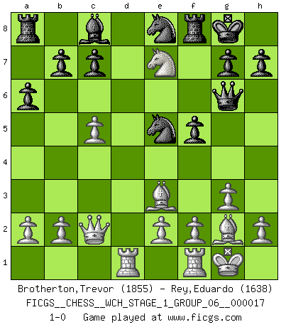 Last move : 1-0 2016 December 5 17:5:33 [Event "FICGS__CHESS__WCH_STAGE_1_GROUP_06__000017"] [Site "FICGS"] [Date "2016.11.02"] [Round "1"] [White "Brotherton,Trevor"] [Black "Rey,Eduardo"] [Result "1-0"] [WhiteElo "1855"] [BlackElo "1638"] 1.g3 d5 2.Bg2 Nf6 3.d3 e5 4.Nf3 Nc6 5.O-O Bd6 6.c4 dxc4 7.dxc4 O-O 8.Nc3 a6 9.Qc2 Ne8 10.Be3 f5 11.Rad1 Qf6 12.Nd5 Qg6 13.c5 Be7 14.Nxe5 Nxe5 15.Nxe7+ 1-0 Benko's Opening Kingside Castling by player White (move 5) Kingside Castling by player Black (move 7) Player White won this chess game. Follow this game move after move (download)I had a toothache during the first game. In the second game I had a headache. In the third game it was an attack of rheumatism. In the fourth game, I wasn't feeling well. And in the fifth game? Well, must one have to win every game ? (Siegbert Tarrasch) Deine Wertungszahl - vorausgesetzt einige Jahre schachliche Anstrengung - entspricht etwa dem zehnfachen Deines IQ plus 1000. (Jonathan Levitt) Siempre es mucho mejor sacrificar las piezas de tu oponente. (Savielly Tartakover) Horreur, mais aussi harmonie suprême : qu'y avait-il en effet au monde en dehors des échecs ? Le brouillard, l'inconnu, le non-être... (Vladimir Nabokov) The human is the only animal species whose members are able to talk themselves into difficulties that would not otherwise exist. (Wendell Johnson)