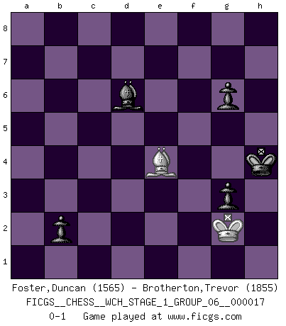 Last move : 0-1 2017 April 26 0:35:25 [Event "FICGS__CHESS__WCH_STAGE_1_GROUP_06__000017"] [Site "FICGS"] [Date "2016.11.02"] [Round "1"] [White "Foster,Duncan"] [Black "Brotherton,Trevor"] [Result "0-1"] [WhiteElo "1565"] [BlackElo "1855"] 1.e4 d6 2.d4 Nf6 3.Nc3 g6 4.f4 Bg7 5.a3 O-O 6.Nf3 b6 7.Bd3 Bb7 8.e5 Nd5 9.Nxd5 Bxd5 10.c4 Bb7 11.O-O c5 12.d5 dxe5 13.fxe5 Nd7 14.Re1 b5 15.b3 e6 16.Bc2 exd5 17.cxd5 Qc7 18.Bf4 Rae8 19.Rc1 Qb8 20.b4 cxb4 21.axb4 Nxe5 22.Bb3 Nxf3+ 23.Qxf3 Rxe1+ 24.Rxe1 Qd8 25.Qe3 a5 26.bxa5 Qxa5 27.Rd1 Bc8 28.h3 Qb4 29.d6 Bd7 30.Bg3 Qc3 31.Rd3 Qb2 32.Kh2 h5 33.Bd5 Qb1 34.Qf3 Qb4 35.Bf4 Bf6 36.Bh6 Be5+ 37.g3 Bg7 38.Bg5 Bf5 39.Rd1 Be5 40.Be7 h4 41.Bxf8 hxg3+ 42.Kh1 Qh4 43.Qf1 Kxf8 44.Bg2 Bd7 45.Qe2 Bf6 46.Qe4 Qh6 47.Kg1 Kg7 48.Rf1 Qd2 49.Qf4 Qc3 50.h4 b4 51.Rf3 Qa1+ 52.Rf1 Qd4+ 53.Qxd4 Bxd4+ 54.Kh1 b3 55.Bd5 b2 56.Kg2 Be5 57.Rxf7+ Kh6 58.Rf1 Bf5 59.d7 Bxd7 60.Re1 Bc3 61.Rd1 Bf5 62.Ba2 Be5 63.Re1 Bd6 64.Bb1 Kh5 65.Re4 Bxe4+ 66.Bxe4 Kxh4 0-1 Pirc : Austrian attack Kingside Castling by player Black (move 5) Kingside Castling by player White (move 11) 10 pieces endgame at move 59 : White KRBP , Black KBBPPP WHITE : King + 1 Rook 1 Bishop 1 Pawn BLACK : King + 2 Bishops 3 Pawns 9 pieces endgame at move 65 : White KBP , Black KBBPPP WHITE : King + 1 Bishop 1 Pawn BLACK : King + 2 Bishops 3 Pawns 8 pieces endgame at move 66 : White KBP , Black KBPPP WHITE : King + 1 Bishop 1 Pawn BLACK : King + 1 Bishop 3 Pawns 7 pieces endgame at move 66 : White KB , Black KBPPP WHITE : King + 1 Bishop BLACK : King + 1 Bishop 3 Pawns Player Black won this chess game. Follow this game move after move (download)Tactics flow from a superior position. (Bobby Fischer) Wenn Schach ein enormer Dschungel ist, der seine Myriaden von Geheimnissen nicht preisgeben will, dann sind Computer die Kettensägen einer gewaltigen ökologisch unsensiblen Nutzholzfirma. (Nigel Short) No es una movida, aún la mejor movida que tu debas buscar, sino un plan comprensible. (Eugene Znosko-Borovsky) Shah mat. Le roi est mort. Cri de fierté d'un joueur venant de terrasser son adversaire, courtoisement, sans effusion de sang. May the force be with you. (Han Solo in Star Wars ep.4)