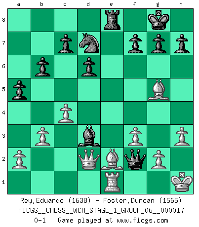Last move : 0-1 2016 December 7 19:42:15 [Event "FICGS__CHESS__WCH_STAGE_1_GROUP_06__000017"] [Site "FICGS"] [Date "2016.11.02"] [Round "1"] [White "Rey,Eduardo"] [Black "Foster,Duncan"] [Result "0-1"] [WhiteElo "1638"] [BlackElo "1565"] 1.e4 e5 2.Nf3 Nc6 3.d4 exd4 4.Nxd4 Bc5 5.Nb3 Bb6 6.Nc3 d6 7.Nd5 Qh4 8.Nxb6 Qxe4+ 9.Be3 axb6 10.Qd2 Nf6 11.f3 Qe5 12.c3 Be6 13.c4 O-O 14.Bd3 Ra5 15.Nxa5 bxa5 16.O-O Nb4 17.Bf4 Qc5+ 18.Be3 Qe5 19.Be2 Nc2 20.Bf4 Qc5+ 21.Kh1 Nxa1 22.Rxa1 Re8 23.b3 Bf5 24.Bg5 Nd7 25.Rd1 b6 26.h3 Qf2 27.Re1 Bd3 0-1 Scotch : Potter variation Kingside Castling by player Black (move 13) Kingside Castling by player White (move 16) Player Black won this chess game. Follow this game move after move (download)Let the perfectionist play postal. (Yasser Seirawan) Der Freibauer hat für mich eine Seele, genau wie der Mensch, Wünsche, die unerkannt in ihm schlummern, und Befürchtungen, von deren Existenz er selbst kaum ahnt. (Aaron Nimzowitsch) Hay dos clases de hombres: aquellos que se conforman en dejarse llevar por las circunstancias y que juegan barajas y aquellos decididos a controlar las circunstancias y que juegan al Ajedrez. (Mortimer Collins) On est toujours la mazette de quelqu'un d'autre. (Anonyme) There are two kinds of people in the world, my friend. Those who have a loaded gun and those who dig. You dig ! (Blondie in The Good, The Bad and The Ugly)