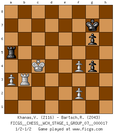 Last move : 1/2-1/2 2016 November 24 7:46:15 [Event "FICGS__CHESS__WCH_STAGE_1_GROUP_07__000017"] [Site "FICGS"] [Date "2016.11.02"] [Round "1"] [White "Khanas,Valeriy"] [Black "Bartsch,Reinhard Andrea"] [Result "1/2-1/2"] [WhiteElo "2116"] [BlackElo "2043"] 1.d4 Nf6 2.Bf4 d5 3.e3 c5 4.Nf3 Nc6 5.dxc5 e6 6.c4 Bxc5 7.a3 O-O 8.Nc3 d4 9.exd4 Nxd4 10.Be2 Qe7 11.O-O Rd8 12.Nxd4 Bxd4 13.Qb3 h6 14.Rad1 e5 15.Bg3 Be6 16.Rfe1 Rac8 17.h3 Nd7 18.Nb5 Nc5 19.Qc2 Qg5 20.h4 Bf5 21.hxg5 Bxc2 22.Rd2 Ba4 23.Nxd4 exd4 24.Be5 Nb3 25.Rd3 hxg5 26.Bd1 Nc1 27.Rxd4 Rxd4 28.Bxd4 Nd3 29.Re3 Nxb2 30.Bxa4 Nxa4 31.Bxa7 Ra8 32.Bd4 Rd8 33.Ba7 Nb2 34.c5 Ra8 35.Bb6 f6 36.Bc7 Rc8 37.Re7 Na4 38.Bb6 Nxc5 39.Kf1 g6 40.g3 Kf8 41.Bxc5 Rxc5 42.Rxb7 Ra5 43.Rb3 f5 44.Ke2 Kg7 45.Kd3 g4 46.Kc4 f4 47.gxf4 1/2-1/2 Queen's pawn game Kingside Castling by player Black (move 7) Kingside Castling by player White (move 11) 10 pieces endgame at move 42 : White KRPPP , Black KRPPP WHITE : King + 1 Rook 3 Pawns BLACK : King + 1 Rook 3 Pawns 9 pieces endgame at move 47 : White KRPPP , Black KRPP WHITE : King + 1 Rook 3 Pawns BLACK : King + 1 Rook 2 Pawns This chess game ended in a draw. Follow this game move after move (download)You cannot play at Chess if you are kind-hearted. (French Proverb) Korrekt heißt in Deutschland die Haltung eines Mannes, dessen Benehmen nach dem Urteile seiner Nachbarn seiner Stellung angemessen ist. Um korrekt zu sein, muß man sich der Meinung der anderen anpassen... (Emanuel Lasker) Un Peón pasado es un criminal, quién debe ser mantenido bajo candado y llave. Leves medidas, tales como vigilancia policiaca, no son suficientes. (Aaron Nimzovich) Des idées, des idées, j'en ai cent, j'en ai mille. Des bonnes, des mauvaises, applicables, irréalisables... Il suffit de faire le tri ! (Roos) Watch your thoughts; they become words. Watch your words; they become actions. Watch your actions; they become habits. Watch your habits; they become character. Watch your character; it becomes your destiny. (Frank Outlaw)