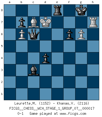 Last move : 0-1 2016 December 11 21:18:55 [Event "FICGS__CHESS__WCH_STAGE_1_GROUP_07__000017"] [Site "FICGS"] [Date "2016.11.02"] [Round "1"] [White "Leurette,Marc-Antoine"] [Black "Khanas,Valeriy"] [Result "0-1"] [WhiteElo "1152"] [BlackElo "2116"] 1.e4 c5 2.Nc3 Nc6 3.g3 g6 4.Bg2 Bg7 5.Nge2 d6 6.d3 Nf6 7.O-O O-O 8.h3 Bd7 9.d4 cxd4 10.Nxd4 Nxe4 11.Nxc6 Nxc3 12.Nxd8 Nxd1 13.Rxd1 Rfxd8 14.c3 Bc6 15.Bf4 d5 16.b4 Bxc3 17.Rab1 d4 18.b5 Bxg2 19.Kxg2 Rac8 20.b6 a6 21.Bc7 Rd5 22.f4 Ra5 23.Kf3 Rxa2 24.h4 f6 25.g4 a5 26.g5 a4 27.Kg4 a3 28.h5 Rc2 29.hxg6 hxg6 30.gxf6 exf6 31.f5 a2 32.Rbc1 Rxc1 33.Rxc1 Kf7 34.Rh1 a1Q 35.Rh7+ Kg8 36.fxg6 Qd1+ 37.Kf5 Qf3+ 38.Ke6 Re8+ 39.Kd7 Qc6+ 0-1 Sicilian : Closed Kingside Castling by player White (move 7) Kingside Castling by player Black (move 7) Promotion Queen by player Black (move 34) Player Black won this chess game. Follow this game move after move (download)Bobby Fischer is the greatest Chess genius of all time ! (Alexander Kotov) Ein Großmeister muß tausende Partien in seinem Kopf speichern, denn diese sind für Ihn, was die Worte der Muttersprache für gewöhnliche Leute sind, oder Noten für Musiker... (Garry Kasparov) Aún el Rey más flojo huye despavorido ante la amenaza de un Jaque doble. (Aaron Nimzowitsch) Ce qui caractérise les parties de combat, c'est que si le défenseur a constamment de difficiles problèmes à résoudre, l'attaquant doit chercher sans relâche de nouvelles possibilités d'attaque. (Koblentz) The various flowers seem good to different people. (Chinese proverb)