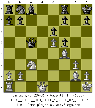 Last move : 1-0 2016 December 22 21:5:20 [Event "FICGS__CHESS__WCH_STAGE_1_GROUP_07__000017"] [Site "FICGS"] [Date "2016.11.02"] [Round "1"] [White "Bartsch,Reinhard Andrea"] [Black "Valentin,Florea"] [Result "1-0"] [WhiteElo "2043"] [BlackElo "1902"] 1.c4 Nf6 2.d4 e6 3.g3 d5 4.Bg2 Be7 5.Nf3 O-O 6.O-O dxc4 7.Ne5 c5 8.dxc5 Bxc5 9.Nxc4 Qc7 10.Nc3 Bxf2+ 11.Rxf2 Qxc4 12.Rxf6 gxf6 13.e4 Qc5+ 14.Kh1 Kh8 15.e5 f5 16.Bf4 1-0 This chess game has been lost on time (started : 2016.11.02 2:19:34) English, 1...Nf6 (Anglo-Indian defense) Kingside Castling by player Black (move 5) Kingside Castling by player White (move 6) Player White won this chess game. Follow this game move after move (download)It is always better to sacrifice your opponent's men. (Savielly Tartakower) Die Elozahlen sind sehr schlecht für das Schach. Jetzt ist Schach eine Sportindustrie, die darauf zielt Elopunkte zu machen. (Miguel Najdorf) Nunca antes ha habido un jugador de Ajedrez con tal conocimiento a fondo de las complejidades del juego y una inmensa voluntad absolutamente indomable de ganar. Yo pienso que Fischer es el jugador mas grande que jamás haya existido. (Lisa Lane) Les Cavaliers se révèlent fort utiles dans les positions fermées. D'habitude, les Fous sont un peu plus forts que les Cavaliers dans les positions ouvertes. Qu'on le veuille ou non, il restera toujours des exceptions ! You lose, general Kenobi. (General Grievous in Star Wars ep.3)