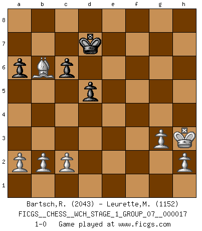 Last move : 1-0 2016 December 4 12:19:4 [Event "FICGS__CHESS__WCH_STAGE_1_GROUP_07__000017"] [Site "FICGS"] [Date "2016.11.02"] [Round "1"] [White "Bartsch,Reinhard Andrea"] [Black "Leurette,Marc-Antoine"] [Result "1-0"] [WhiteElo "2043"] [BlackElo "1152"] 1.e4 e5 2.Nf3 Nc6 3.d4 exd4 4.Nxd4 Bc5 5.Be3 Bxd4 6.Bxd4 Nf6 7.Nc3 d6 8.Be3 Be6 9.Bb5 Qd7 10.Bg5 a6 11.Bxc6 Qxc6 12.Qd4 Qc4 13.Bxf6 Qxd4 14.Bxd4 f6 15.Nd5 Bxd5 16.exd5 O-O-O 17.O-O h5 18.Rfe1 Rde8 19.f3 h4 20.Kf2 h3 21.Rxe8+ Rxe8 22.g3 Rf8 23.Re1 g5 24.Re6 f5 25.Rf6 Rxf6 26.Bxf6 g4 27.fxg4 fxg4 28.Ke3 Kd7 29.Kf4 c6 30.dxc6+ bxc6 31.Kxg4 Ke6 32.Bd8 Kd7 33.Bb6 d5 34.Kxh3 1-0 Scotch game Queenside Castling by player Black (move 16) Kingside Castling by player White (move 17) Player White won this chess game. Follow this game move after move (download)After black's reply to 1.e4 with 1..e5, leaves him always trying to get into the game. (Howard Staunton) Kann Schach nicht schließlich das Nationalspiel der Deutschen werden? Und welche weiteren Ausblicke bieten sich dann dar! Welche Hebung des allgemeinen Kultur-Niveaus, ja der Moral, wenn das Schachbrett den Kartentisch verdrängen würde! Wahrlich, ein Ziel, des Schweißes der Edlen wert! (Siegbert Tarrasch) Aquellos que dicen entender al Ajedrez, no entienden nada. (Robert Hubner) J'ai vu le vaincu d'Echecs jouer des années durant dans l'espoir de la fête de la victoire. Car tu es plus riche de ce qu'elle existe si même elle n'est point pour toi. Ainsi de la perle du fond des mers. (Antoine de Saint-Exupéry) If only faces could talk... (Pat Summerall, Sportscaster during the Super Bowl)