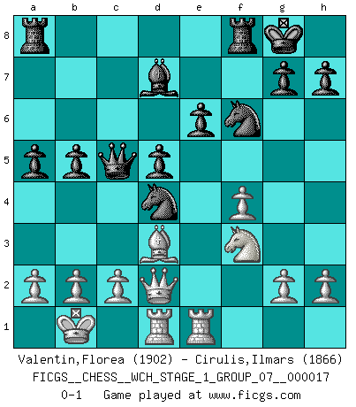 Last move : 0-1 2016 December 24 9:15:21 [Event "FICGS__CHESS__WCH_STAGE_1_GROUP_07__000017"] [Site "FICGS"] [Date "2016.11.02"] [Round "1"] [White "Valentin,Florea"] [Black "Cirulis,Ilmars"] [Result "0-1"] [WhiteElo "1902"] [BlackElo "1866"] 1.e4 e6 2.d4 d5 3.Nc3 Nf6 4.Bg5 Be7 5.e5 Nfd7 6.Bxe7 Qxe7 7.f4 O-O 8.Nf3 a6 9.Bd3 f6 10.exf6 Nxf6 11.Qd2 c5 12.dxc5 Qxc5 13.O-O-O Nc6 14.Rhe1 b5 15.Kb1 Bd7 16.Ne2 a5 17.Ned4 Nxd4 0-1 This chess game has been lost on time (started : 2016.11.02 2:19:34) French : Classical, Steinitz variation Kingside Castling by player Black (move 7) Queenside Castling by player White (move 13) Player Black won this chess game. Follow this game move after move (download)Man is a frivolous, a specious creature, and like a Chess player, cares more for the process of attaining his goal than for the goal itself. (Dostoyevsky) Es macht mich traurig, wenn ich sehe, dass Golfprofis mehr verdienen als Schachsportler. Obwohl ich davon überzeugt bin, dass wir Schachspieler viel härter trainieren müssen als die Golfer. (Alexandra Kosteniuk) El Ajedrez es un regaderazo frío para la mente. (Sir John Simon) Il vaut mieux sacrifier les pièces de l'adversaire. (Xavier Tartacover) If passion drives you, let reason holds the reins. (Benjamin Franklin)