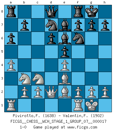 Last move : 1-0 2016 December 26 21:19:34 [Event "FICGS__CHESS__WCH_STAGE_1_GROUP_07__000017"] [Site "FICGS"] [Date "2016.11.02"] [Round "1"] [White "Pivirotto,Filiberto"] [Black "Valentin,Florea"] [Result "1-0"] [WhiteElo "1638"] [BlackElo "1902"] 1.e4 c5 2.Nf3 d6 3.d4 cxd4 4.Nxd4 Nf6 5.Nc3 a6 6.Be2 e5 7.Nb3 Be7 8.O-O O-O 9.Be3 Be6 10.Qd2 Nbd7 11.a4 1-0 This chess game has been lost on time (started : 2016.11.02 2:19:34) Sicilian : Najdorf, Opovcensky variation Kingside Castling by player White (move 8) Kingside Castling by player Black (move 8) Player White won this chess game. Follow this game move after move (download)First-class players lose to second-class players because second-class players sometimes play a first-class game. (Siegbert Tarrasch) Die Fehler sind da, Sie warten nur darauf gemacht zu werden. (Savielly Grigorievitsch Tartakower) El jugador táctico debe saber que hacer cuando algo se debe de hacer. El estratégico debe saber que hacer cuando nada se debe de hacer. (Savielly Tartakover) Je ne suis pas le dernier à jouer lâchement des coups douteux pendant le zeïtnot de l'adversaire pour l'achever: en effet les coups qui font le plus peur sont ceux que l'on ne comprend pas. Je me fais souvent peur quand je joue. (Un professeur anonyme) As the days dwindle down... to a precious few. (Maxwell Anderson)