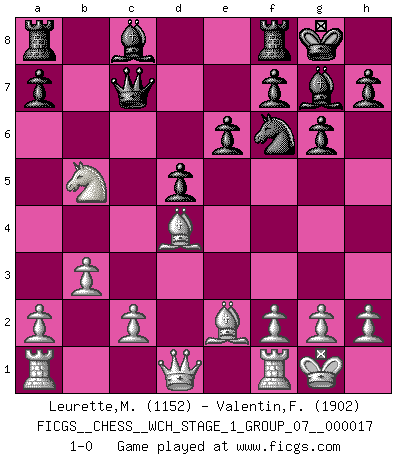 Last move : 1-0 2016 December 25 21:19:6 [Event "FICGS__CHESS__WCH_STAGE_1_GROUP_07__000017"] [Site "FICGS"] [Date "2016.11.02"] [Round "1"] [White "Leurette,Marc-Antoine"] [Black "Valentin,Florea"] [Result "1-0"] [WhiteElo "1152"] [BlackElo "1902"] 1.e4 c5 2.Nc3 Nc6 3.Nf3 g6 4.d4 cxd4 5.Nxd4 Bg7 6.Be3 Nf6 7.Be2 O-O 8.O-O d5 9.Nxc6 bxc6 10.exd5 cxd5 11.Bd4 e6 12.b3 Qc7 13.Nb5 1-0 This chess game has been lost on time (started : 2016.11.02 2:19:34) Sicilian : Closed, 2...Nc6 Kingside Castling by player Black (move 7) Kingside Castling by player White (move 8) Player White won this chess game. Follow this game move after move (download)Chess opens and enriches your mind. (Saudin Robovic) Der Verteidiger gebe der Gewalt nach, aber nur der Gewalt. Er schaffe sich nicht freiwillig, etwa aus Blindheit oder aus Schrecken, irgendwelche Schwächen. Er lasse sich nicht bluffen. (Emanuel Lasker) Hasta este punto, las blancas han seguido un análisis bien conocido. Pero ahora el hace un error fatal: empieza a usar su propia cabeza. (Siegbert Tarrasch) Horreur, mais aussi harmonie suprême : qu'y avait-il en effet au monde en dehors des échecs ? Le brouillard, l'inconnu, le non-être... (Vladimir Nabokov) Those who make the worst use of their time are the first to complain of its brevity. (Jean de la Bruyere)