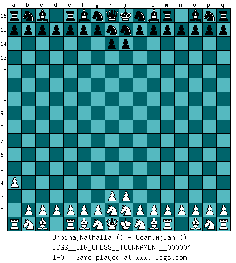 Last move : 1-0 2007 May 14 9:9:8 [Event "FICGS__BIG_CHESS__TOURNAMENT__000004"] [Site "FICGS"] [Date "2007.03.30"] [Round "1"] [White "Urbina,Nathalia"] [Black "Ucar,Ajlan"] [Result "1-0"] [WhiteElo ""] [BlackElo ""] 1.a2-a4 1-0 This big chess game has been lost on time (started : 2007.03.30 22:20:0) Follow this game move after move (download)The essence of Chess is thinking about what Chess is. (David Bronstein) Ich bin stolz ein Bulgare zu sein. (Veselin Topalov) Uno no tiene que jugar muy bien, es suficiente jugar mejor que el oponente. (Siegbert Tarrasch) Aidez vos pièces, elles vous aideront. (Paul Morphy) A good programmer is someone who always looks both ways before crossing a one-way street. (Doug Linder)