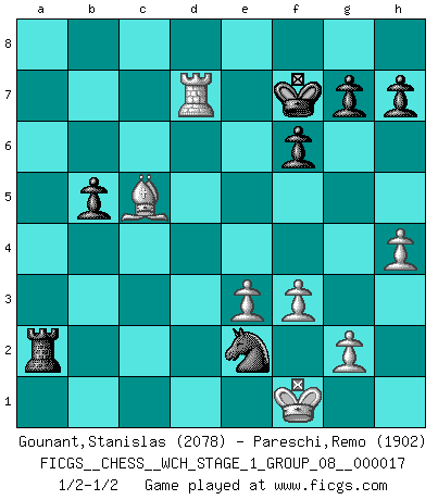 Last move : 1/2-1/2 2017 January 31 1:17:41 [Event "FICGS__CHESS__WCH_STAGE_1_GROUP_08__000017"] [Site "FICGS"] [Date "2016.11.02"] [Round "1"] [White "Gounant,Stanislas"] [Black "Pareschi,Remo"] [Result "1/2-1/2"] [WhiteElo "2078"] [BlackElo "1902"] 1.d4 d5 2.Nf3 Nf6 3.e3 c6 4.c4 e6 5.Nbd2 c5 6.cxd5 exd5 7.b3 Nc6 8.Bb2 a6 9.Be2 Bd6 10.Qc2 cxd4 11.Nxd4 Nb4 12.Qd1 O-O 13.a3 Nc6 14.O-O Nxd4 15.Bxd4 Bd7 16.b4 Qe7 17.Nb3 Ne4 18.Bb2 Qe6 19.Qd4 f6 20.Nc5 Bxc5 21.bxc5 Bb5 22.Bxb5 axb5 23.Rfd1 Rfc8 24.Rac1 Ra4 25.Qxd5 Qxd5 26.Rxd5 Rc4 27.f3 Nxc5 28.Rcd1 b6 29.h4 Rc2 30.Rd8+ Rxd8 31.Rxd8+ Kf7 32.Bd4 Ra2 33.Rd6 Na4 34.Rd7+ Kg8 35.Rd5 Nc5 36.Rd6 Na4 37.Bxb6 Rxa3 38.Bd4 Nc3 39.Bc5 Ne2+ 40.Kf1 Ra2 41.Rd8+ Kf7 42.Rd7+ 1/2-1/2 Queen's pawn game Kingside Castling by player Black (move 12) Kingside Castling by player White (move 14) This chess game ended in a draw. Follow this game move after move (download)Why must I lose to this idiot ? (Aron Nimzovich) Es gibt zwei Arten von Opfern: Korrekte und meine. (Mikhail Nekhemyevich Tal) Cuando estes solo, cuando te sientas un extraño en el mundo, juega al Ajedrez. Esto levantará tu espiritu y será tu consejero de guerra. (Aristóteles) Je ne crois pas en la psychologie, je crois aux bons coups. (Robert Fischer) We need strong personalities and only one world champion to attract sponsors. (Anatoly Karpov)