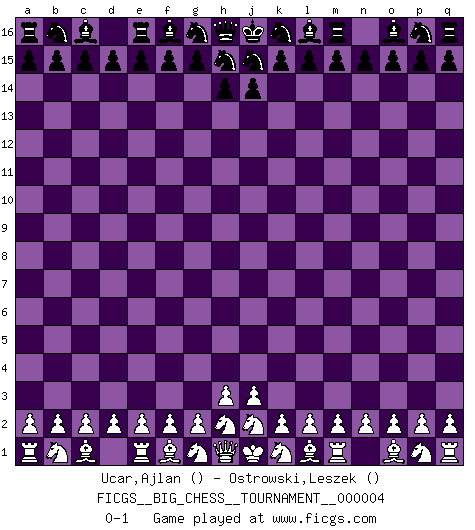 Last move : 0-1 2007 April 30 1:10:50 [Event "FICGS__BIG_CHESS__TOURNAMENT__000004"] [Site "FICGS"] [Date "2007.03.30"] [Round "1"] [White "Ucar,Ajlan"] [Black "Ostrowski,Leszek"] [Result "0-1"] [WhiteElo ""] [BlackElo ""] 0-1 This big chess game has been lost on time (started : 2007.03.30 22:20:0) Follow this game move after move (download)Adequate compensation for a sacrifice is having a sound combination leading to a winning position; adequate compensation for a blunder is having your opponent snatch defeat from the jaws of victory. (Bruce A. Moon) Irgendwie scheint mir sonntags früh um 9 Uhr der Killerinstinkt verloren gegangen zu sein. (Alexej Shirov) Cuando tengo las piezas blancas, yo gano porque soy blanco; Cuando tengo las piezas negras, yo gano porque soy Bogolyubov. (Bogolyubov) Le jeu d'échecs est comme rejeté hors du temps. (Antoine de Saint-Exupéry) Philosophers use a language that is already deformed as though by shoes that are too tight. (Ludwig Wittgenstein)