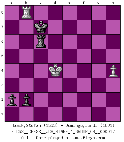 Last move : 0-1 2017 March 26 9:56:45 [Event "FICGS__CHESS__WCH_STAGE_1_GROUP_08__000017"] [Site "FICGS"] [Date "2016.11.02"] [Round "1"] [White "Haack,Stefan"] [Black "Domingo,Jordi"] [Result "0-1"] [WhiteElo "1593"] [BlackElo "1891"] 1.e4 e5 2.Nf3 f5 3.Nxe5 Qf6 4.d4 d6 5.Nc4 fxe4 6.Nc3 Qg6 7.f3 exf3 8.Qxf3 Nc6 9.Nb5 Bg4 10.Qe3+ Kd7 11.Bd3 Qf7 12.Qg3 Be6 13.Ne3 Re8 14.Bd2 a6 15.Nc3 Nxd4 16.Ne4 d5 17.Ng5 Bd6 18.Qh3 Qf6 19.Nxe6 Qxe6 20.Qh4 Nf5 21.Bxf5 Qxf5 22.O-O-O Qe4 23.Qh3+ Qe6 24.Qxe6+ Kxe6 25.Rhf1 Ne7 26.Bc3 Rhf8 27.Bxg7 Rxf1 28.Rxf1 Rg8 29.Bc3 Bc5 30.Rf6+ Kd7 31.Bd2 d4 32.Nc4 Rxg2 33.b4 Ng8 34.Rf4 Be7 35.Rxd4+ Kc8 36.Bf4 Bxb4 37.Nb6+ cxb6 38.Rxb4 b5 39.a4 bxa4 40.Rxa4 Ne7 41.Rc4+ Nc6 42.Re4 Rg4 43.Kd2 b5 44.Ke3 a5 45.Kf3 Rg7 46.Bd6 Rd7 47.Re8+ Kb7 48.Be5 Rd2 49.c3 Nxe5+ 50.Rxe5 Kb6 51.Rh5 Rd3+ 52.Ke4 Rxc3 53.Rxh7 a4 54.Kd4 b4 55.Rf7 a3 56.Rf6+ Rc6 57.Rf8 a2 58.Ra8 b3 59.h4 b2 60.Rb8+ Kc7 0-1 This chess game has been lost on time (started : 2016.11.02 2:19:36) Latvian counter-gambit Queenside Castling by player White (move 22) 10 pieces endgame at move 49 : White KRPP , Black KRNPPP WHITE : King + 1 Rook 2 Pawns BLACK : King + 1 Rook 1 Knight 3 Pawns 9 pieces endgame at move 50 : White KRPP , Black KRPPP WHITE : King + 1 Rook 2 Pawns BLACK : King + 1 Rook 3 Pawns 8 pieces endgame at move 52 : White KRP , Black KRPPP WHITE : King + 1 Rook 1 Pawn BLACK : King + 1 Rook 3 Pawns 7 pieces endgame at move 53 : White KRP , Black KRPP WHITE : King + 1 Rook 1 Pawn BLACK : King + 1 Rook 2 Pawns Player Black won this chess game. Follow this game move after move (download)Not all artists are Chess players, but all Chess players are artists. (Marcel Duchamp) Sicherlich können nur Meister einen Stil haben. Daß ein nicht-Meister auch nur ein einziges Mal in seinem Leben eine Partie folgerecht durchführte, habe ich niemals bemerkt. (Emanuel Lasker) Personalmente, yo prefiero mirar hacia el futuro en donde un programa de computadora gane el título mundial de Ajedrez. La humanidad necesita una lección de humildad. (Richard Dawkings) Les réformistes prétendent que les progrès de la théorie conduiront à la disparition des échecs, et qu'il faut, pour leur rendre vie, en remanier les règles. En réalité, qu'exprime cette affirmation? Le mépris de l'intuition, de l'imagination et de tous les autres éléments qui font des échecs un art. (Alexander Alekhine) Patience, use the Force, think ! (Obi-Wan Kenobi in Star Wars ep.2)