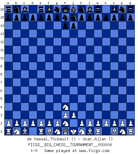 Last move : 1-0 2007 April 30 1:10:50 [Event "FICGS__BIG_CHESS__TOURNAMENT__000004"] [Site "FICGS"] [Date "2007.03.30"] [Round "1"] [White "de Vassal,Thibault"] [Black "Ucar,Ajlan"] [Result "1-0"] [WhiteElo ""] [BlackElo ""] 1.j2-h4 1-0 This big chess game has been lost on time (started : 2007.03.30 22:20:0) Follow this game move after move (download)For surely of all the drugs in the world, Chess must be the most permanently pleasurable. (Assiac) Bogoljubow: Matt in vier Zügen! Tartakower: Ich verbitte mir jede Belästigung! (Savielly Grigorievitsch Tartakower) a manera como él juega al Ajedrez, demuestra la completa naturaleza de un hombre. (Stanley Ellin) On peut tirer plus d'utilité d'une partie perdue que de 100 parties gagnées. (Capablanca) Man is still the most extraordinary computer of all. (John F. Kennedy)