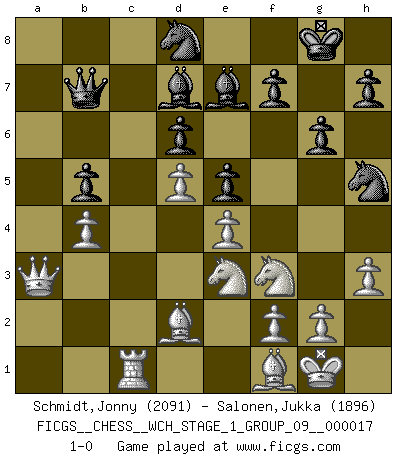 Last move : 1-0 2016 December 4 7:37:52 [Event "FICGS__CHESS__WCH_STAGE_1_GROUP_09__000017"] [Site "FICGS"] [Date "2016.11.02"] [Round "1"] [White "Schmidt,Jonny"] [Black "Salonen,Jukka"] [Result "1-0"] [WhiteElo "2091"] [BlackElo "1896"] 1.e4 e5 2.Nf3 Nc6 3.Bb5 a6 4.Ba4 Nf6 5.O-O Be7 6.Re1 b5 7.Bb3 d6 8.c3 O-O 9.h3 Na5 10.Bc2 c5 11.d4 Qc7 12.Nbd2 cxd4 13.cxd4 Bb7 14.d5 Bc8 15.Rb1 Bd7 16.Bd3 g6 17.b3 Nh5 18.Nf1 Rfc8 19.Ne3 Nb7 20.b4 a5 21.a3 Qd8 22.Bd2 axb4 23.axb4 Qe8 24.Rc1 Ra3 25.Rxc8 Qxc8 26.Qb1 Nf4 27.Bf1 Nd8 28.Rc1 Qb7 29.Qb2 Nh5 30.Qxa3 1-0 Ruy Lopez : Closed Kingside Castling by player White (move 5) Kingside Castling by player Black (move 8) Player White won this chess game. Follow this game move after move (download)By this measure (on the gap between Fischer & his contemporaries), I consider him the greatest world champion. (Garry Kasparov) Spielt Blackmar-Diemer-Gambit, und das Matt kommt von selbst! (Emil Joseph Diemer) Solo los afeminados hacen el Enroque. (Rob Sillars) Pour moi, les échecs ne sont pas un jeu mais un art. (Alexandre Alekhine) Wisdom begins at the end. (Daniel Webster)
