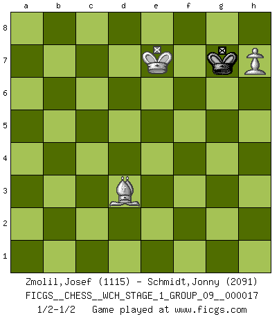 Last move : 1/2-1/2 2017 July 13 17:29:51 [Event "FICGS__CHESS__WCH_STAGE_1_GROUP_09__000017"] [Site "FICGS"] [Date "2016.11.02"] [Round "1"] [White "Zmolil,Josef"] [Black "Schmidt,Jonny"] [Result "1/2-1/2"] [WhiteElo "1115"] [BlackElo "2091"] 1.e4 c5 2.Nf3 Nc6 3.d4 cxd4 4.Nxd4 Nf6 5.Nc3 e6 6.Ndb5 Bb4 7.a3 Bxc3+ 8.Nxc3 d5 9.exd5 exd5 10.Bd3 d4 11.Qe2+ Be6 12.Ne4 Nxe4 13.Qxe4 Qd5 14.Bf4 Qa5+ 15.Bd2 Qh5 16.Bb4 a5 17.Bd6 Rd8 18.Qf4 Qd5 19.Bc7 Rd7 20.O-O O-O 21.Bb6 Qe5 22.Qd2 Qd5 23.Rfe1 Bf5 24.Rad1 h6 25.Bf1 Qd6 26.Kh1 Rc8 27.Bb5 Qg6 28.Ba4 Rd6 29.c3 Ne5 30.Rxe5 Rxb6 31.cxd4 Rc4 32.b3 Rc2 33.Qe3 Re6 34.h3 Rxe5 35.dxe5 Be4 36.Rg1 Bd3 37.Bd7 Re2 38.Qc5 Qg5 39.Qd6 Bg6 40.e6 Qf6 41.b4 axb4 42.exf7+ Bxf7 43.Qxb4 Rb2 44.Qe4 Qd6 45.Bg4 Rxf2 46.Rd1 Rd2 47.Rxd2 Qxd2 48.Qxb7 Qc1+ 49.Kh2 Qxa3 50.Qc7 Qb2 51.Qd6 Qa2 52.Qf4 Bd5 53.Qb8+ Kf7 54.Bh5+ g6 55.Qc7+ Ke6 56.Qb6+ Ke5 57.Qxg6 Bxg2 58.Qxg2 Qxg2+ 59.Kxg2 Kf4 60.Bd1 Kg5 61.Kg3 Kf5 62.Bf3 Kg5 63.h4+ Kf5 64.h5 Kg5 65.Bd1 Kf5 66.Kh4 Kf4 67.Bc2 Kf3 68.Kh3 Kf4 69.Kg2 Kg4 70.Bg6 Kf4 71.Kf2 Kg4 72.Ke3 Kg5 73.Ke4 Kf6 74.Kd5 Ke7 75.Ke5 Kf8 76.Kf6 Kg8 77.Bc2 Kh8 78.Kg6 Kg8 79.Kxh6 Kh8 80.Bd3 Kg8 81.Kg6 Kh8 82.h6 Kg8 83.Kf6 Kh8 84.Ke7 Kg8 85.Ke8 Kh8 86.h7 Kg7 87.Ke7 1/2-1/2 Sicilian defense Kingside Castling by player White (move 20) Kingside Castling by player Black (move 20) 10 pieces endgame at move 49 : White KQBPP , Black KQBPP WHITE : King + 1 Queen 1 Bishop 2 Pawns BLACK : King + 1 Queen 1 Bishop 2 Pawns 9 pieces endgame at move 57 : White KQBPP , Black KQBP WHITE : King + 1 Queen 1 Bishop 2 Pawns BLACK : King + 1 Queen 1 Bishop 1 Pawn 8 pieces endgame at move 57 : White KQBP , Black KQBP WHITE : King + 1 Queen 1 Bishop 1 Pawn BLACK : King + 1 Queen 1 Bishop 1 Pawn 7 pieces endgame at move 58 : White KQBP , Black KQP WHITE : King + 1 Queen 1 Bishop 1 Pawn BLACK : King + 1 Queen 1 Pawn 6 pieces endgame at move 58 : White KBP , Black KQP WHITE : King + 1 Bishop 1 Pawn BLACK : King + 1 Queen 1 Pawn 5 pieces endgame at move 59 : White KBP , Black KP WHITE : King + 1 Bishop 1 Pawn BLACK : King + 1 Pawn 4 pieces endgame at move 79 : White KBP , Black K WHITE : King + 1 Bishop 1 Pawn BLACK : King + This chess game ended in a draw. Follow this game move after move (download)Look at Garry Kasparov. After he loses, invariably he wins the next game. He just kills the next guy. That's something that we have to learn to be able to do. (Maurice Ashley) Im Fernschach kannst du während dem Spiel rauchen. (John Christen Knudsen) Un juego de Ajedrez es un dialogo, una conversación entre un jugador y su oponente. Cada movimiento del oponente puede contener amenazas o tropiezos, pero un jugador no se puede defender de las amenazas o tomar ventaja de los tropiezos si es que no se pregunta a sí mismo: ¿Que es lo que mi oponente va a hacer después de cada movida?. (Bruce A. Moon) Il n'y a plus de joueurs du niveau de Jacob Murray dont la seule quête est le beau jeu, le plaisir de voir les pièces construire quelque chose. Sur 10 idées à la minute, 9 seront sans intérêt, la dernière s'avèrera géniale. (Christian Bauer) It is not titles that honor men, but men that honor titles. (Niccolo Machiavelli)