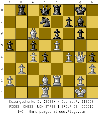 Last move : 1-0 2016 December 25 14:58:28 [Event "FICGS__CHESS__WCH_STAGE_1_GROUP_09__000017"] [Site "FICGS"] [Date "2016.11.02"] [Round "1"] [White "Kolomytchenko,Igor"] [Black "Duenas,Alexis"] [Result "1-0"] [WhiteElo "2083"] [BlackElo "1900"] 1.e4 c5 2.Nf3 d6 3.d4 cxd4 4.Nxd4 Nf6 5.Nc3 a6 6.Bg5 e6 7.Qf3 h6 8.Be3 Nc6 9.Nxc6 bxc6 10.Be2 d5 11.Bf4 Bb7 12.O-O h5 13.Rad1 h4 14.h3 Be7 15.Rfe1 O-O 16.Bd3 g6 17.Bh6 Re8 18.e5 Nh7 19.Qg4 Bf8 20.Bf4 Qe7 21.b3 c5 22.Nb1 Bg7 23.Nd2 Rac8 24.c4 d4 25.Ne4 Bxe4 26.Bxe4 a5 27.Bd2 Qd8 28.f4 Nf8 29.Bb7 Rb8 30.Bc6 Nd7 31.Re2 1-0 Sicilian : Najdorf, 6...e6 Kingside Castling by player White (move 12) Kingside Castling by player Black (move 15) Player White won this chess game. Follow this game move after move (download)In Fischer's hands, a slight theoretical advantage is as good a being a Queen ahead. (Isaac Kashdan) Es liegt in der Natur, vernüftig zu denken und unlogisch zu handeln. (Anatole France) La mitad de las variaciones que son calculadas en una partida de torneo, resultan ser completamente superfluas. Desafortunadamente, nadie sabe por adelantado cual mitad. (Jan Tinman) Un millionnaire : 'Monsieur Steinitz ! Vous ne participez aux tournois que pour l'argent, alors que moi je n'y viens que pour l'honneur.' Steinitz : 'Chacun joue pour ce qu'il n'a pas'... Have no fear of perfection - you'll never reach it. (Salvador Dali)