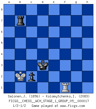 Last move : 1/2-1/2 2017 March 27 8:20:53 [Event "FICGS__CHESS__WCH_STAGE_1_GROUP_09__000017"] [Site "FICGS"] [Date "2016.11.02"] [Round "1"] [White "Salonen,Jukka"] [Black "Kolomytchenko,Igor"] [Result "1/2-1/2"] [WhiteElo "1896"] [BlackElo "2083"] 1.e4 c6 2.d4 d5 3.e5 Bf5 4.Nf3 e6 5.Be2 h6 6.Nbd2 Ne7 7.O-O Nd7 8.Nb3 g5 9.a4 Bg7 10.Bd2 a5 11.h4 g4 12.Ne1 h5 13.Nd3 Ng6 14.g3 Nxh4 15.Ndc5 Nxc5 16.Nxc5 Bf8 17.Nxb7 Qb6 18.Nd6+ Bxd6 19.exd6 Ng6 20.c4 dxc4 21.Bg5 Qb3 22.Qc1 Qb8 23.Bf6 Rh7 24.Be5 Kd7 25.Bxc4 h4 26.Qg5 Qf8 27.Ra3 Nxe5 28.dxe5 f6 29.Qxf6 Qxf6 30.exf6 hxg3 31.Bd3 Rf8 32.Bxf5 exf5 33.f3 gxf3 34.Raxf3 Rxf6 35.Rxf5 Rxf5 36.Rxf5 Rh2 37.Rxa5 Rxb2 38.Rg5 g2 39.Rxg2 Rb1+ 40.Kf2 Kxd6 41.Rg6+ Kc5 42.Rg5+ Kb6 43.Rg8 Ra1 44.Rb8+ Kc5 45.a5 Rxa5 46.Rb1 Ra4 47.Rc1+ Kb5 48.Rb1+ Rb4 49.Re1 c5 50.Ke3 c4 51.Rc1 Rb3+ 52.Kd2 Kb4 53.Ra1 Rb2+ 54.Kc1 Rg2 55.Ra6 Kb3 56.Rb6+ Kc3 57.Kb1 Rg1+ 58.Ka2 Rd1 59.Ra6 Kc2 60.Rg6 c3 61.Rg2+ Rd2 62.Rg1 Kd3 63.Ka3 Kc4 64.Rf1 Rg2 65.Re1 Kd3 66.Rc1 Kd2 67.Rf1 Kd3 68.Ra1 Rg8 69.Rf1 Ra8+ 70.Kb3 Rb8+ 71.Ka2 Rb2+ 72.Ka1 Re2 73.Kb1 Kd2 74.Rc1 Re7 75.Rc2+ Kd3 76.Rc1 Rb7+ 77.Ka2 c2 78.Rf1 Rc7 79.Kb2 Rb7+ 80.Ka2 Re7 81.Kb2 Rb7+ 82.Ka2 Ra7+ 83.Kb2 Rb7+ 1/2-1/2 Caro-Kann : Advance variation Kingside Castling by player White (move 7) 10 pieces endgame at move 36 : White KRPPP , Black KRPPP WHITE : King + 1 Rook 3 Pawns BLACK : King + 1 Rook 3 Pawns 9 pieces endgame at move 37 : White KRPPP , Black KRPP WHITE : King + 1 Rook 3 Pawns BLACK : King + 1 Rook 2 Pawns 8 pieces endgame at move 37 : White KRPP , Black KRPP WHITE : King + 1 Rook 2 Pawns BLACK : King + 1 Rook 2 Pawns 7 pieces endgame at move 39 : White KRPP , Black KRP WHITE : King + 1 Rook 2 Pawns BLACK : King + 1 Rook 1 Pawn 6 pieces endgame at move 40 : White KRP , Black KRP WHITE : King + 1 Rook 1 Pawn BLACK : King + 1 Rook 1 Pawn 5 pieces endgame at move 45 : White KR , Black KRP WHITE : King + 1 Rook BLACK : King + 1 Rook 1 Pawn This chess game ended in a draw. Follow this game move after move (download)Who is your opponent tonight, tonight I am playing against the Black pieces. (Akiba Rubinstein) Zum Sieg gelangt man nicht, wenn man gut, sondern nur wenn man besser spielt (Savielly Grigorievitsch Tartakower) Si pudieramos observar el interior de la cabeza de un jugador de Ajedrez, encontraríamos ahí un mundo lleno de sentimientos, imágenes, ideas, emoción y pasión. (Alfred Binet) Le jeu d'échecs fait naître et fortifie en nous plusieurs qualités précieuses dans le cours de l'existence, telles que la prévoyance, la circonspection, la prudence, et la persévérance. (Benjamin Franklin - 1783, la morale des échecs) The quality of decision is like the well-timed swoop of a falcon which enables it to strike and destroy its victim. (Sun Tzu)