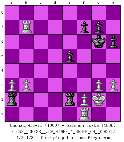 Last move : 1/2-1/2 2016 November 24 13:9:3 [Event "FICGS__CHESS__WCH_STAGE_1_GROUP_09__000017"] [Site "FICGS"] [Date "2016.11.02"] [Round "1"] [White "Duenas,Alexis"] [Black "Salonen,Jukka"] [Result "1/2-1/2"] [WhiteElo "1900"] [BlackElo "1896"] 1.d4 d5 2.c4 e6 3.Nf3 Nf6 4.g3 dxc4 5.Bg2 c5 6.O-O Nc6 7.Qa4 Bd7 8.Qxc4 Rc8 9.dxc5 Na5 10.Qh4 Rxc5 11.Nc3 Be7 12.Qd4 O-O 13.Ne5 Nc6 14.Nxc6 Bxc6 15.Qxd8 Rxd8 16.Be3 Ra5 17.Rfd1 Rc8 18.a3 h6 19.Bxc6 Rxc6 20.h3 Kh7 21.Kg2 Kg6 22.Bd4 e5 23.Be3 Kf5 24.Bd2 Rac5 25.e4+ Kg6 26.Be3 Rc4 27.Bxa7 Nxe4 28.Nxe4 Rxe4 29.Rd7 Bc5 30.Bxc5 Rxc5 31.Rxb7 Re2 32.Rf1 R5c2 33.b3 Ra2 1/2-1/2 Queen's gambit declined Kingside Castling by player White (move 6) Kingside Castling by player Black (move 12) This chess game ended in a draw. Follow this game move after move (download)You cannot play at Chess if you are kind-hearted. (French Proverb) Heutzutage gewinnt im Turnier nicht derjenige Spieler, der weitreichende Pläne entwirft, sondern einfach jener, der Zug um Zug kämpft. (David Bronstein) No todos los artistas son jugadores de Ajedrez, pero todos los jugadores de Ajedrez son artistas. (Marcel Duchamp) Même si vous avez un bon coup à faire, regardez toujours s'il n'y en a pas un qui lui soit préférable. (Pedro Damiano) The modern world has divided itself into Conservatives and Progressives. The business of Progressives is to go on making mistakes. The business of the Conservatives is to prevent the mistakes from being corrected. (G.K. Chesterton)