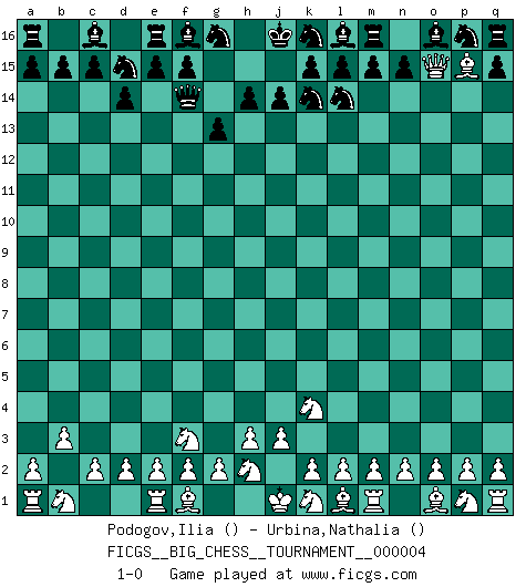 Last move : 1-0 2007 May 20 4:11:0 [Event "FICGS__BIG_CHESS__TOURNAMENT__000004"] [Site "FICGS"] [Date "2007.03.30"] [Round "1"] [White "Podogov,Ilia"] [Black "Urbina,Nathalia"] [Result "1-0"] [WhiteElo ""] [BlackElo ""] 1.j2-k4 g15-g13 2.h1-o7 d15-d14 3.o7-o15 j15-l14 4.b2-b3 h16-f14 5.g1-f3 b16-d15 6.c1-b2 h15-k14 7.b2-p15 1-0 This big chess game has been lost on time (started : 2007.03.30 22:20:0) Follow this game move after move (download)If one piece is badly posted, the whole game is bad. (Tarrasch) Ivan Sokolov treibt mich als Beifahrer an mit go Loeky go - . (Loek van Wely) Ciertamente, de todas la drogas del mundo, el Ajedrez debe ser el mas placentero permamentemente. (Assiac) Il a essayé de se convaincre qu'il pourrait empêcher toutes les erreurs et ne jamais perdre. L'horreur ! Gary Kasparov au sujet de Robert Fischer. In theory there is no difference between theory and practice. In practice there is. (Yogi Berra)