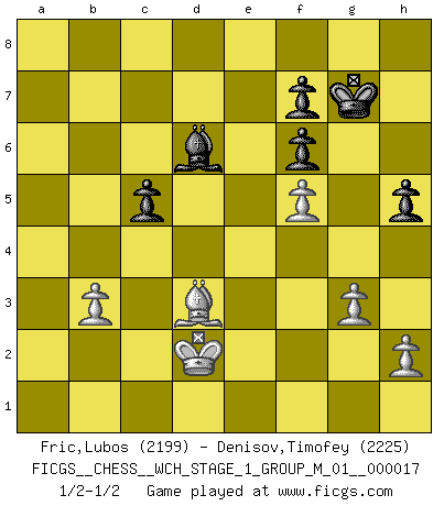 Last move : 1/2-1/2 2017 April 18 13:24:18 [Event "FICGS__CHESS__WCH_STAGE_1_GROUP_M_01__000017"] [Site "FICGS"] [Date "2016.11.02"] [Round "1"] [White "Fric,Lubos"] [Black "Denisov,Timofey"] [Result "1/2-1/2"] [WhiteElo "2199"] [BlackElo "2225"] 1.e4 c5 2.Nf3 d6 3.d4 cxd4 4.Nxd4 Nf6 5.Nc3 a6 6.Bg5 e6 7.f4 Qc7 8.Bxf6 gxf6 9.Qf3 b5 10.a3 Nc6 11.Nxc6 Qxc6 12.O-O-O Rb8 13.Be2 Be7 14.Rd4 Bd7 15.f5 Qc5 16.Rhd1 a5 17.b4 axb4 18.axb4 Qe5 19.Qh5 h6 20.fxe6 Bxe6 21.Nd5 Bxd5 22.Rxd5 Qc3 23.R5d3 Qxb4 24.Rb3 Qc5 25.Bxb5+ Kf8 26.Qxc5 dxc5 27.Be2 Rxb3 28.cxb3 Rg8 29.g3 Rg5 30.Rf1 Re5 31.Bd3 Kg7 32.Kd2 Bd6 33.Rf5 Rxf5 34.exf5 h5 1/2-1/2 Sicilian : Najdorf, 7.f4 Queenside Castling by player White (move 12) This chess game ended in a draw. Follow this game move after move (download)For surely of all the drugs in the world, Chess must be the most permanently pleasurable. (Assiac) Schon mancher Spieler hat aufgegeben, um zu vermeiden, daß er eine Figur verliert. (Savielly Grigorievitsch Tartakower) Yo jugué Ajedrez con el y a veces le pude haber ganado solo que siempre devuelve su última jugada y juega la partida de manera diferente. (Mark Twain) Les erreurs sont comme les malheurs, elles n'arrivent jamais seules. (Siegbert Tarrasch) When you don't know what to do, walk fast and look worried. (Anonymous)